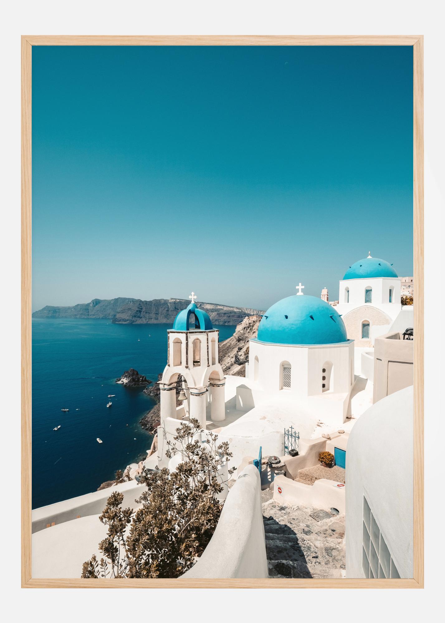 A bright seaside poster of a small Greek town by the deep blue sea. All the buildings are a stunning bright white, topped with blue domes that match the bright blue of the sea and sky. Imagine it's your balcony and your window view when you hang this up at home.