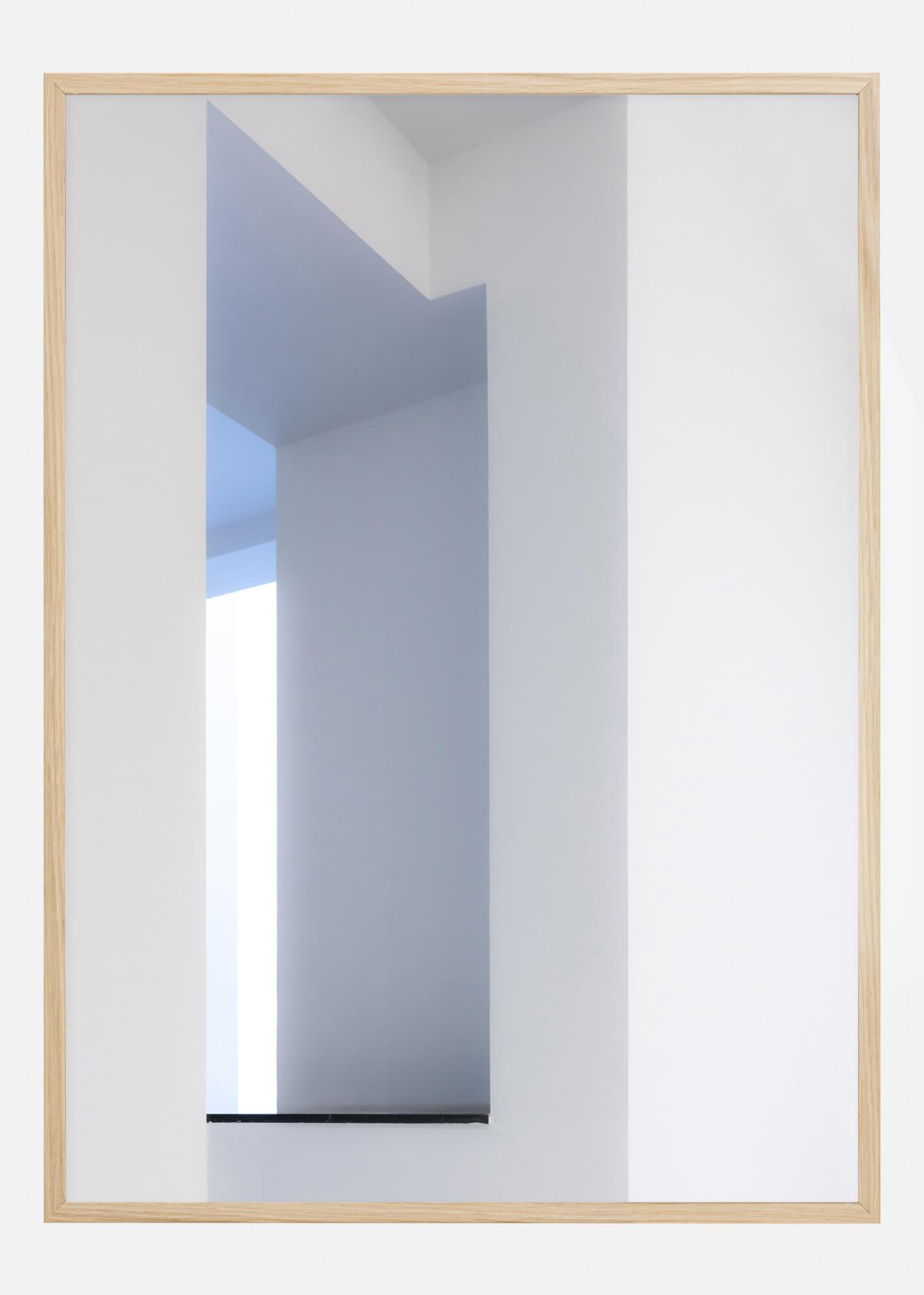 An interior poster of walls and a window. The white and grey walls and geometric shapes lead the eye to the window and the bright white wall and blue sky that's beyond. Hang this in a darker room to bring the feeling and illusion of light and space to brighten it up.