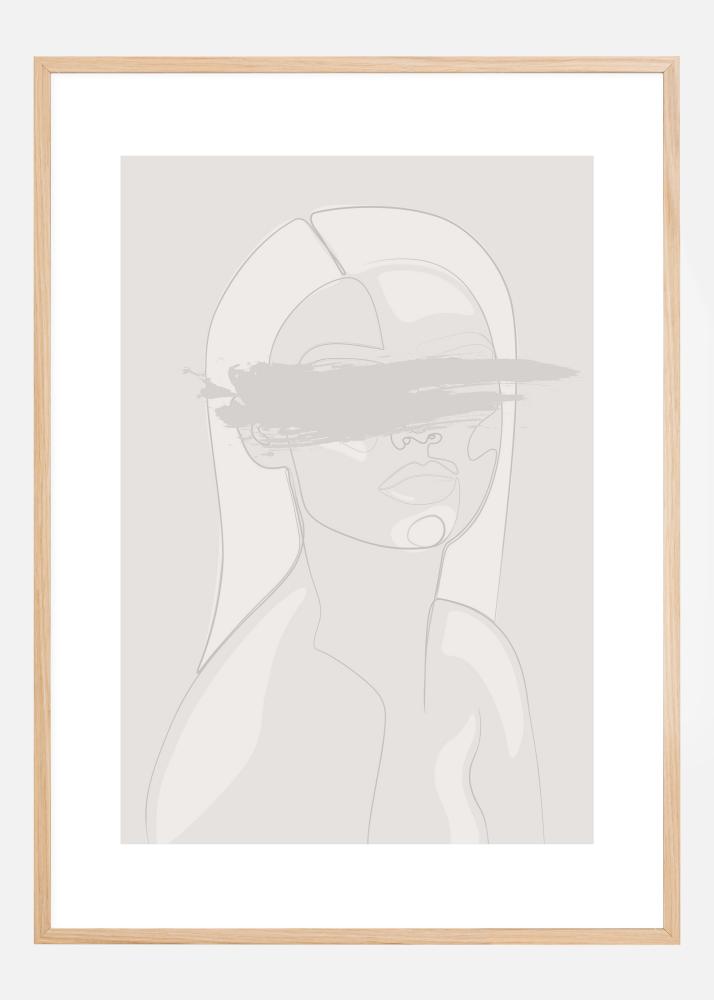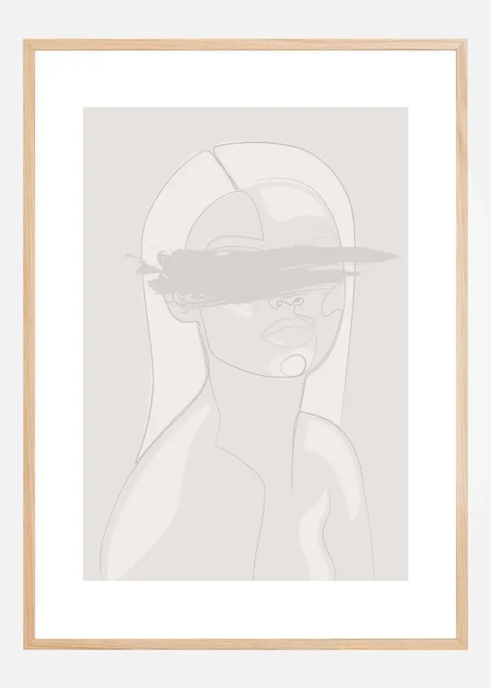 An abstract poster of a woman with her eyes blocked out. This pale white and grey piece outlines a woman's head and shoulders in block shapes and lines. A splash of paint covers her eyes creating mystery around the woman. A strong white border frames her, perfect for adding to a bold solid colour wall at home.