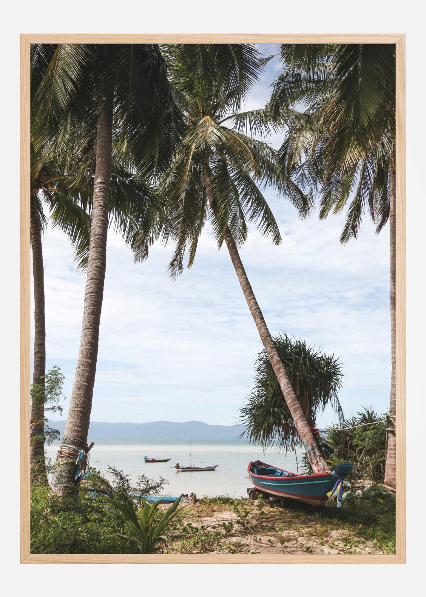 A holiday poster of palm trees and boats in Thailand. Two palm trees lean in towards each other framing the sea behind where two boats lie. A third red and blue boat sits on land drawing the eye in. Imagine you are at the beach in this tranquil image.