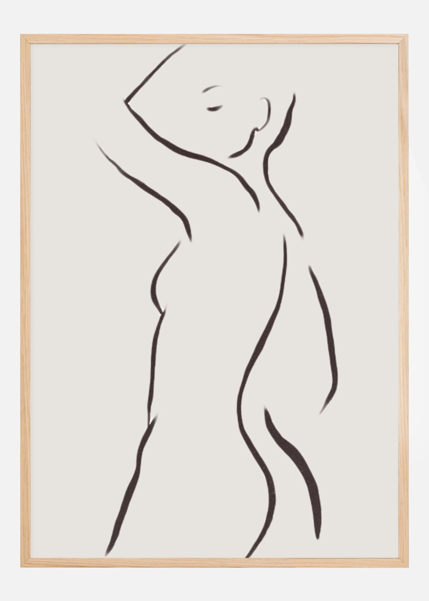 A line drawing poster of a woman reaching up. Simple brush strokes create the flowing form of this woman's head and torso as she stands strong, yet peaceful. Looking down, she raises her left arm high. Pair with a bright wall to make the lines pop.