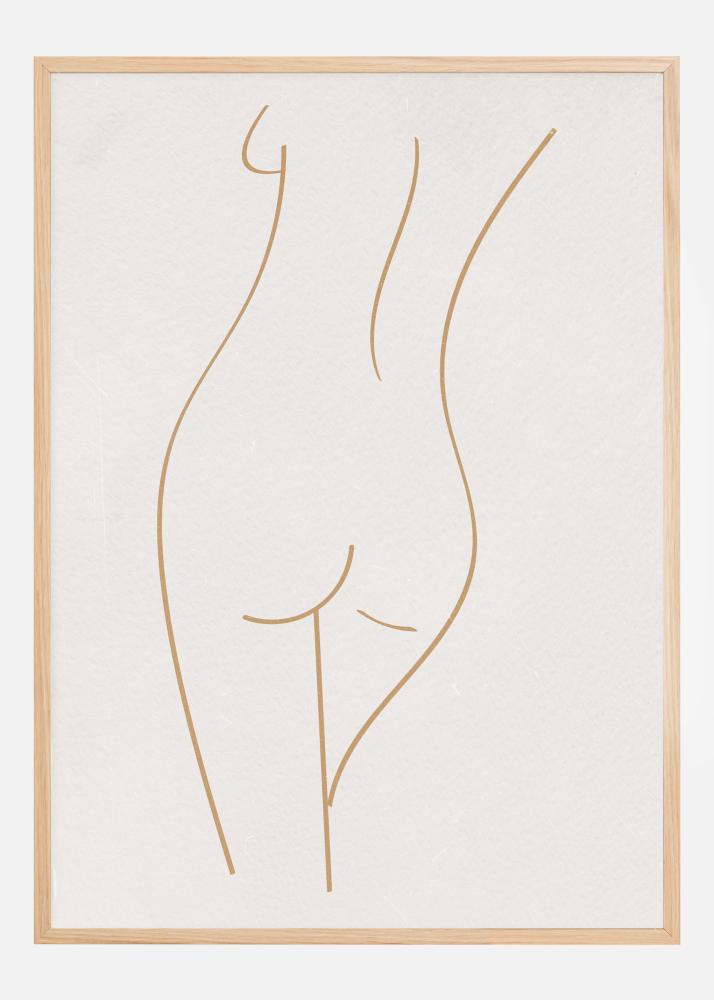 A simple line drawing poster of the back of a woman. Thin brown lines are all that are needed to create the shape of a woman posing from behind. The lines draw the eye up her back in this simple, but elegant drawing on a white background.