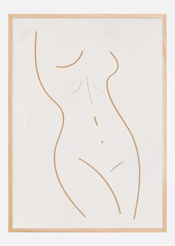 A life drawing poster of a woman in brown lines. Strong, bold brown lines outline the woman's legs, stomach and chest. The lines are smooth, flowing upward in this elegant action drawing. Hang this on a simple white wall for that gallery feel.