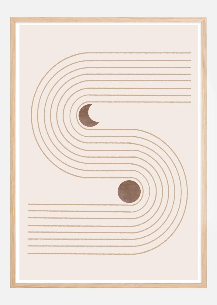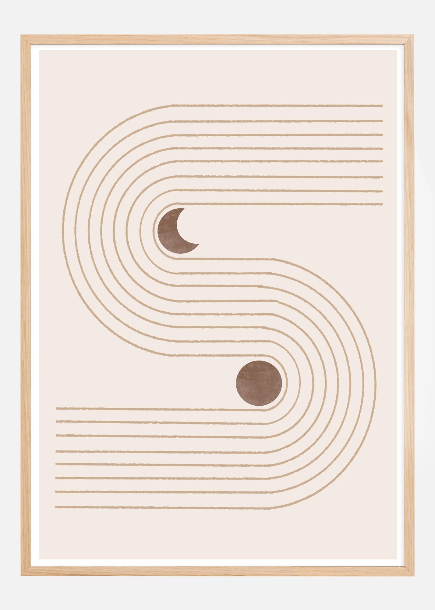 This poster offers a minimalist interpretation of bohemian shapes and celestial bodies with its sweeping arches and lines forming a harmonious pattern. It features a calming palette of earthy tones, with touches of dark brown circles that may represent moons or planets, giving the design a cosmic touch. The arches convey a sense of movement and flow, while the round shapes contribute an element of balance and symmetry.