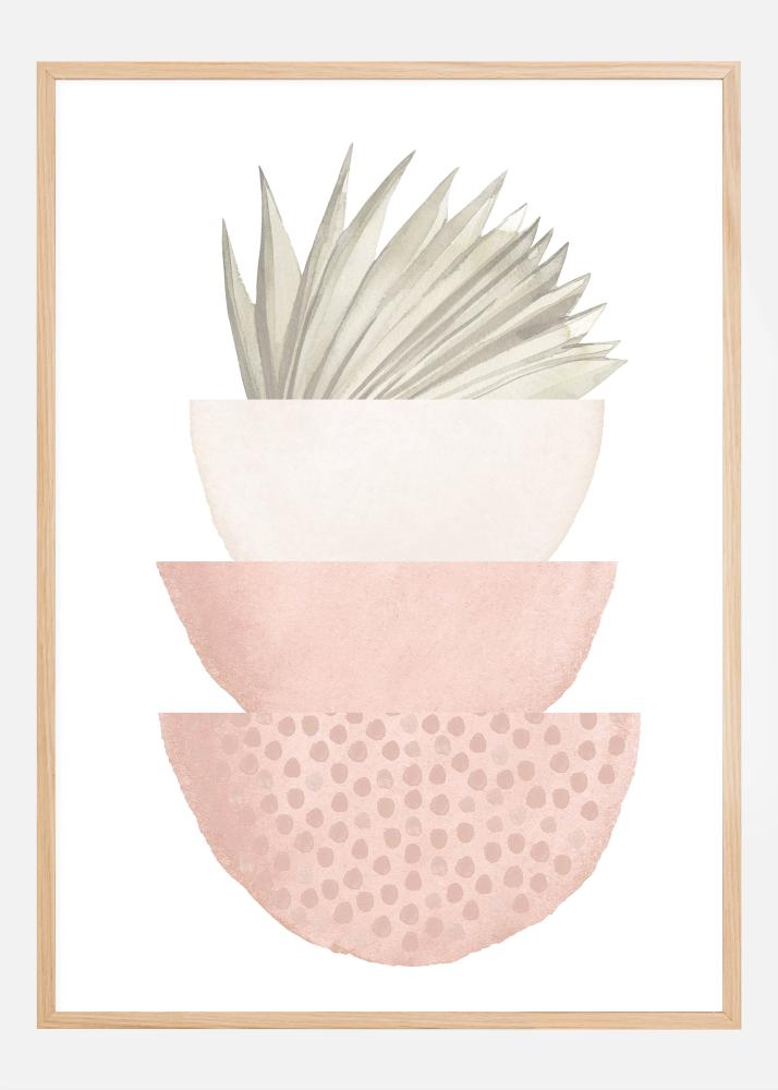 This stylish poster is a tribute to minimalist design and stripped-down aesthetics. A gray-green plant emerges from a semicircular bowl in pink tones with a delicate dotted texture, all set against a neutral background. The contrast between the stark plant and the soft bowl creates a pleasant balance. This art print is perfect for adding a relaxed and organic feel to the room and fits well in a modern, Scandinavian, or bohemian interior style.