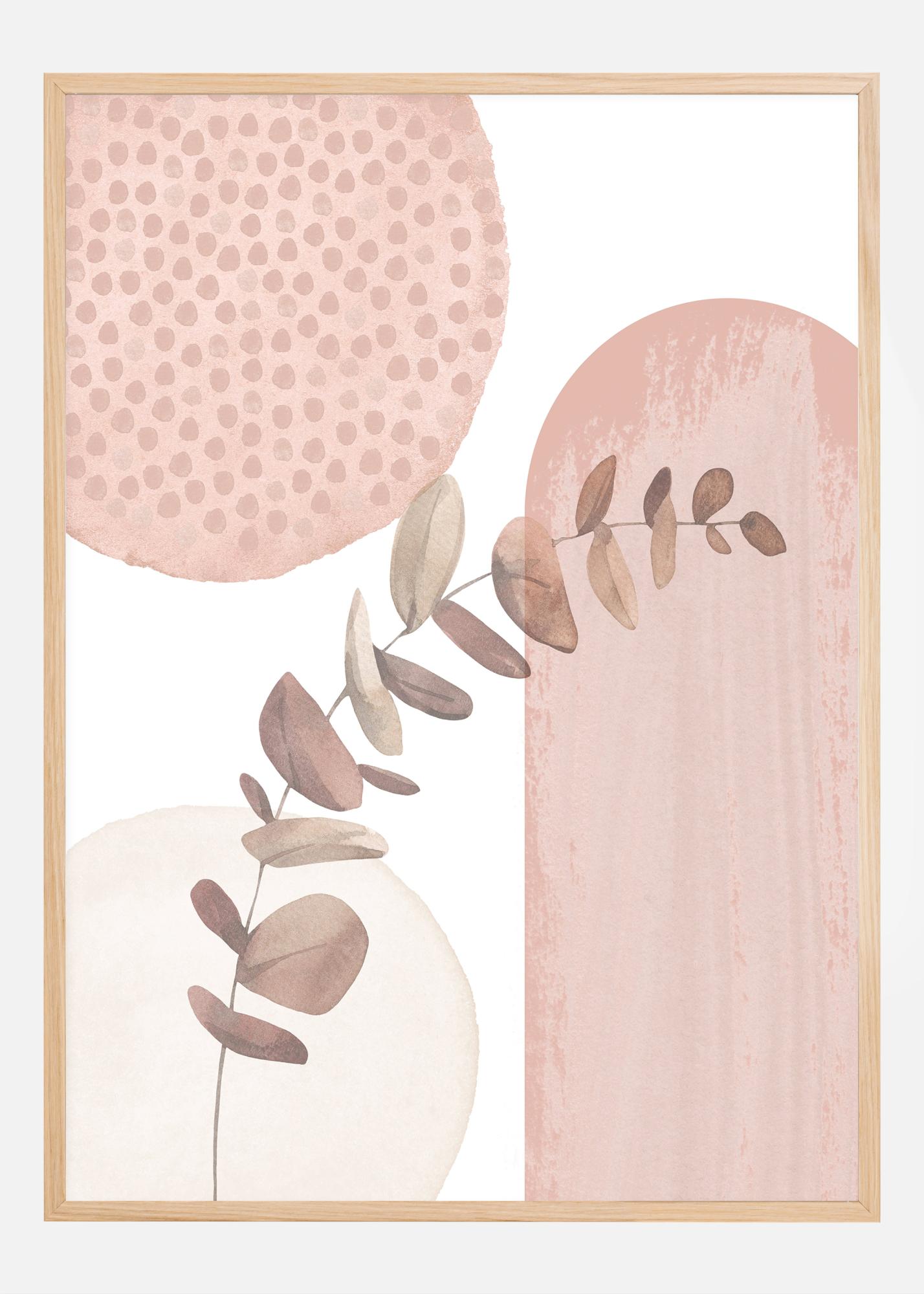 This tranquil and stylish poster depicts a sophisticated and minimalist flower illustration in a pleasant palette of pink and neutral tones. The motif, which seems to flow over multiple abstract shapes, is both modern and timeless. A simple plant branch with elegant leaves extends across the composition, while the background of circular patterns and soft colors creates a sense of space and depth. This art print is an excellent interior detail for anyone who appreciates calm colors and subtle design in their home.