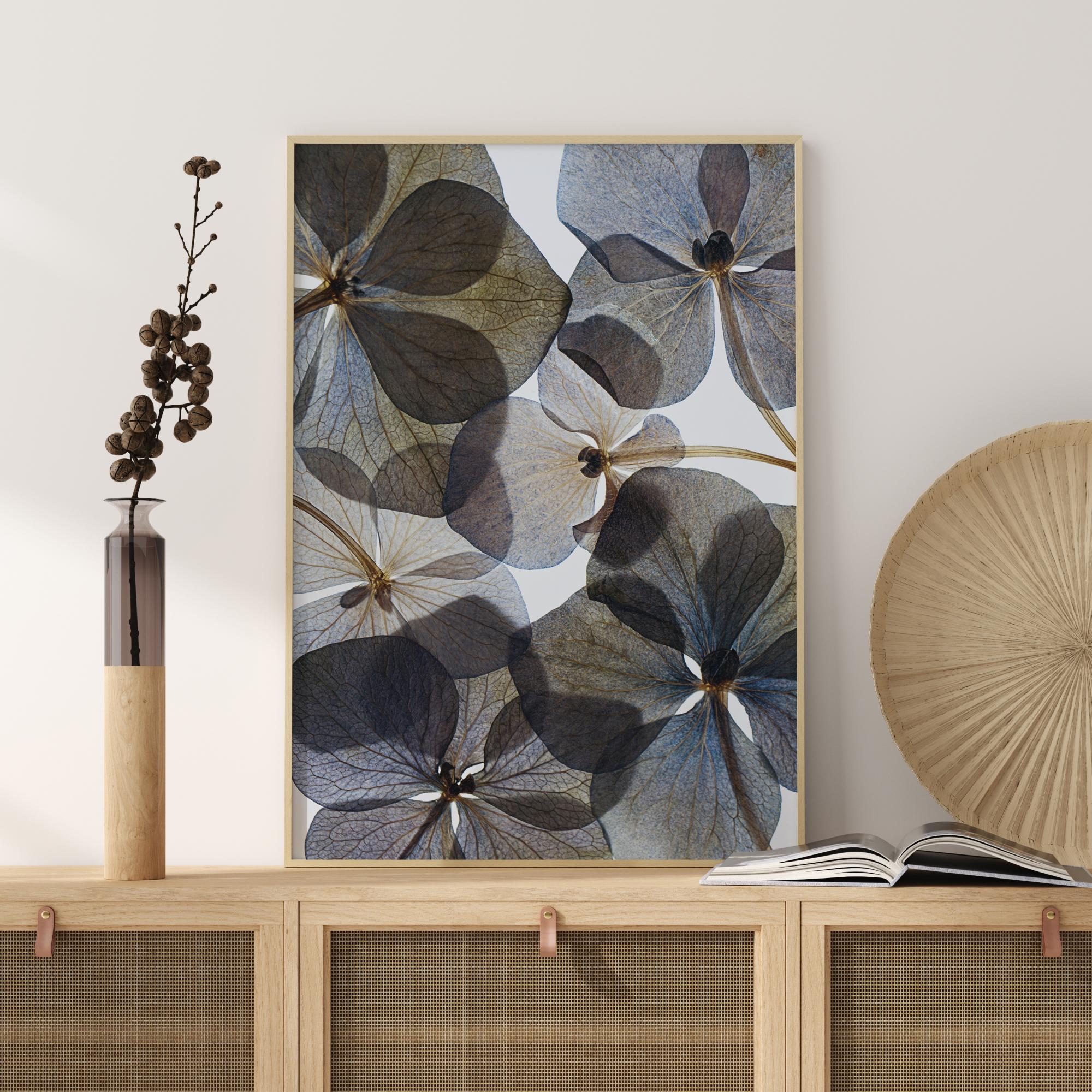 A botanical poster filled with transparent blue and brown flowers. The white light of the background shines through these petals, some of which overlap so that they are darker than others. Hang this up and imagine you are underneath these stunning, wide petals for a tranquil vibe.