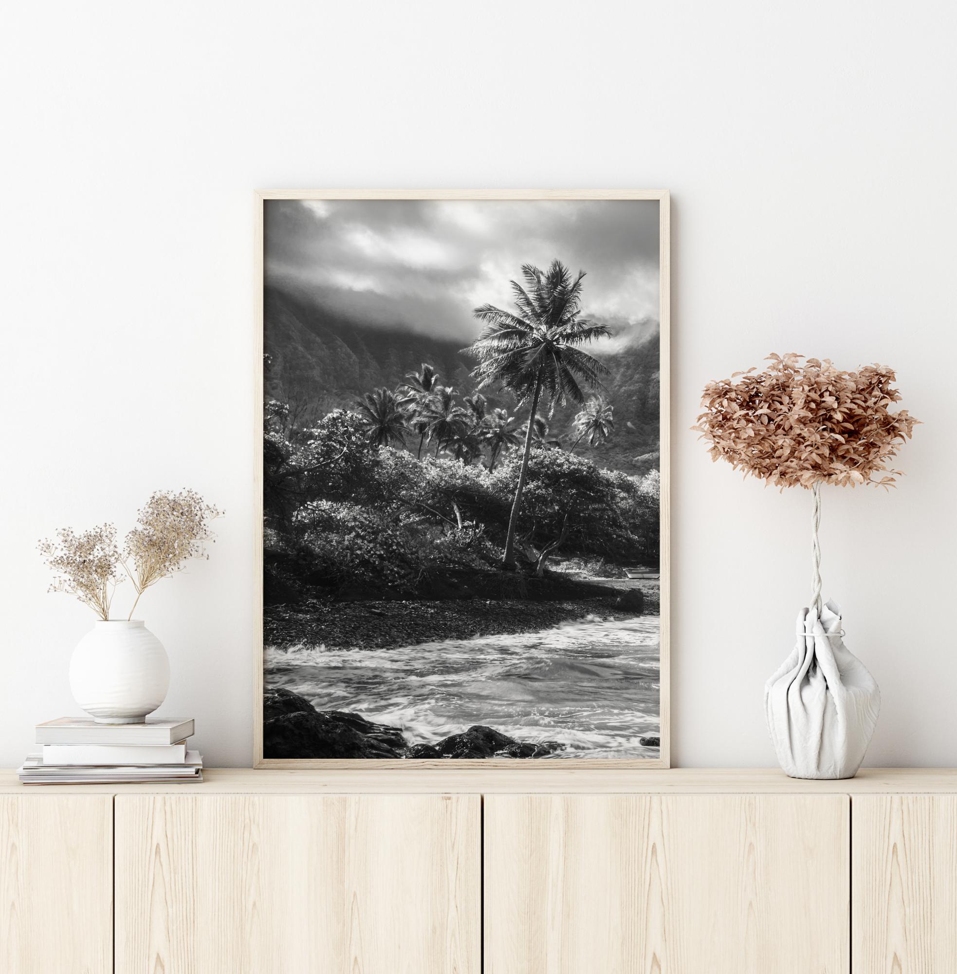 A nature poster of an incoming storm as the sea meets the land. An overcast sky darkens the photo as the palm trees sway in the wind. A frothy sea hits the rocky shore creating impending action. Bring drama home when you hang this black and white print up on a neutral wall.