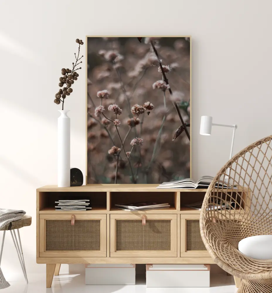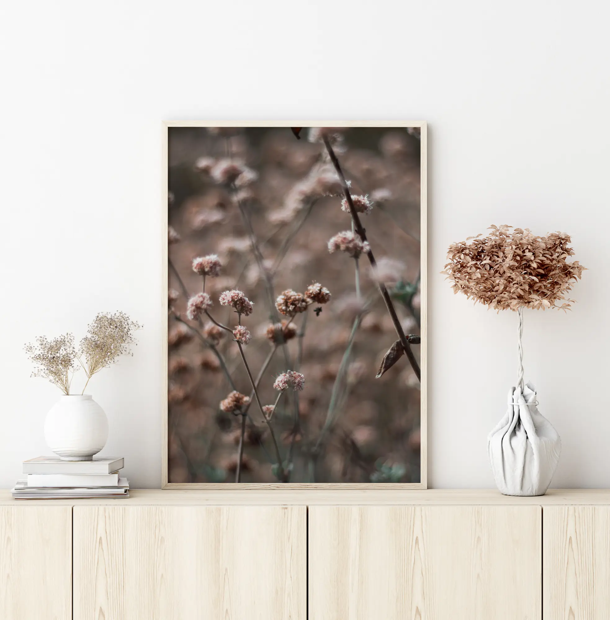 A spring time poster with gentle blooming flowers in a field. Soft pink pastel flowers fill the image, the subtle green stems drawing the eye down to the out of focus flowers in the background creating depth and space. Immerse yourself in soft nature when you put this on your wall.