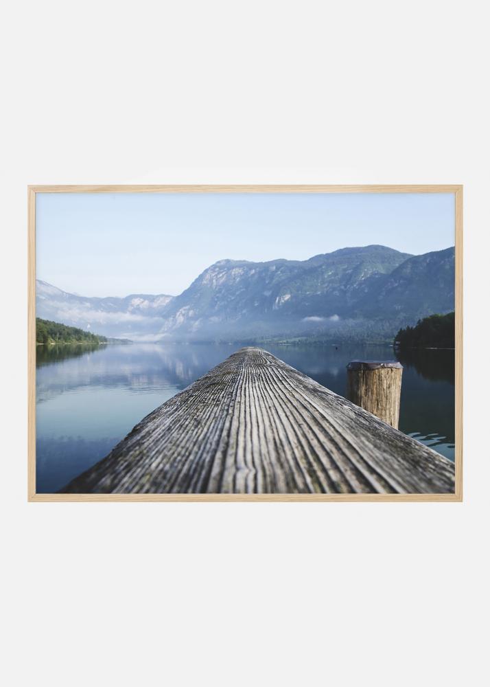 View over a magnificent fjord landscape from a weathered pier. Landscape print in blue tones that fits just as well as a single painting on the wall as together with marine accessories or other paintings. Complement with a grey wooden frame to enhance the colours in the painting, or a thinner black frame for a more minimalist expression.
