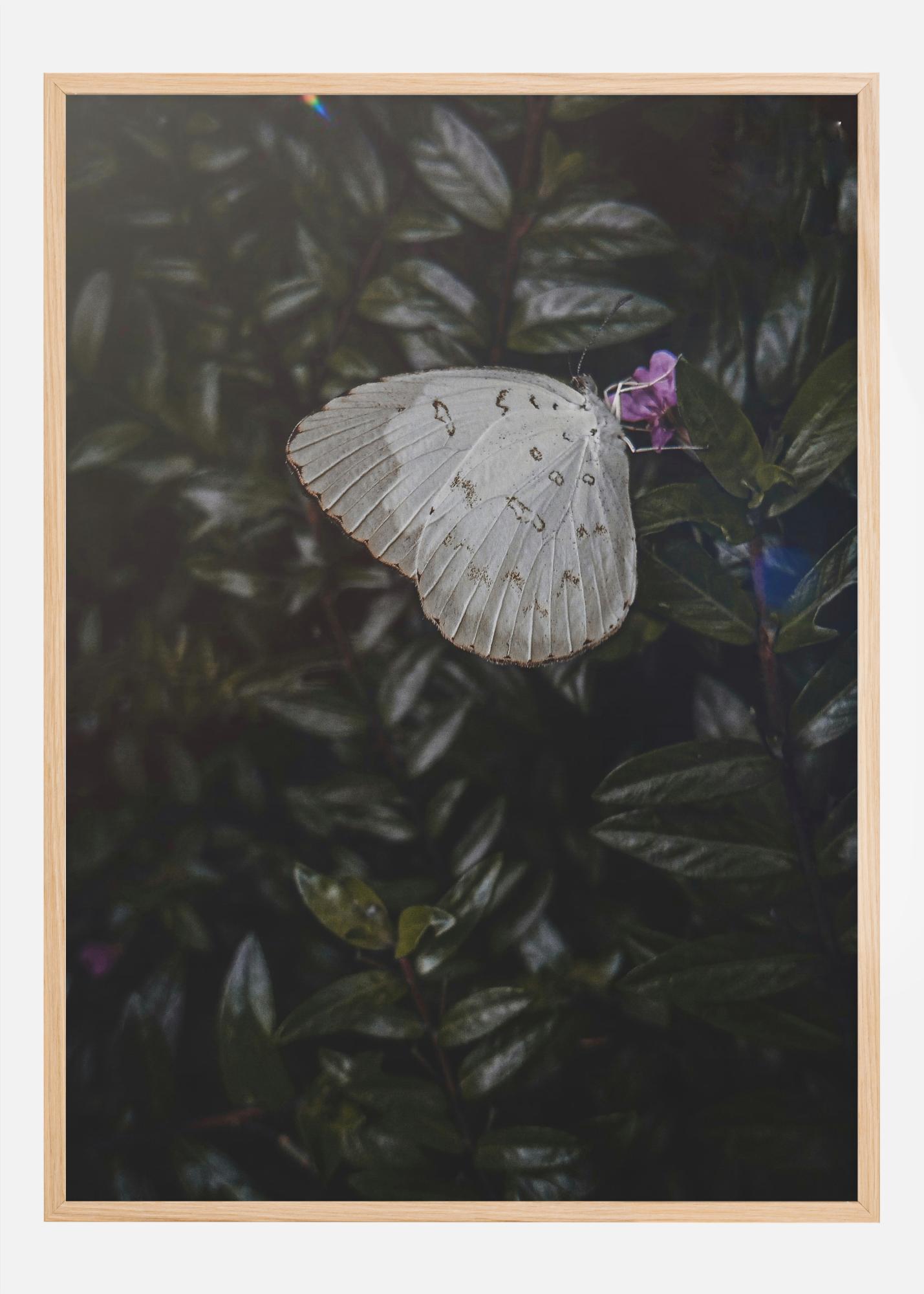 Discover the silent beauty of nature through this thought-provoking poster depicting a delicate butterfly at rest. It is elegantly placed against a lush background of dark green leaves, and its pale white wings with subtle patterns of gray and black highlight its fragility and grace. This image is a serene reminder of nature's fleeting and enchanting moments.