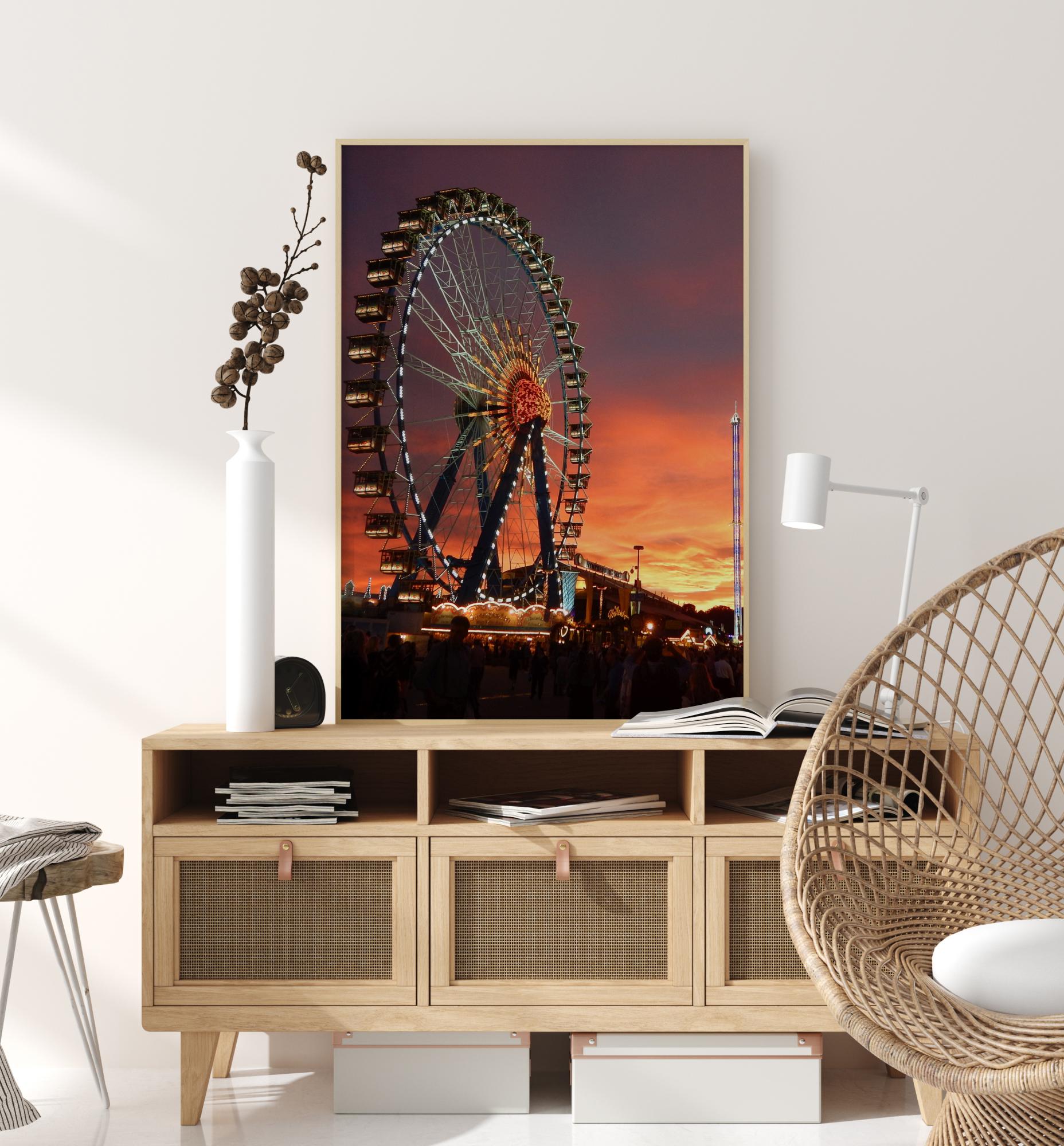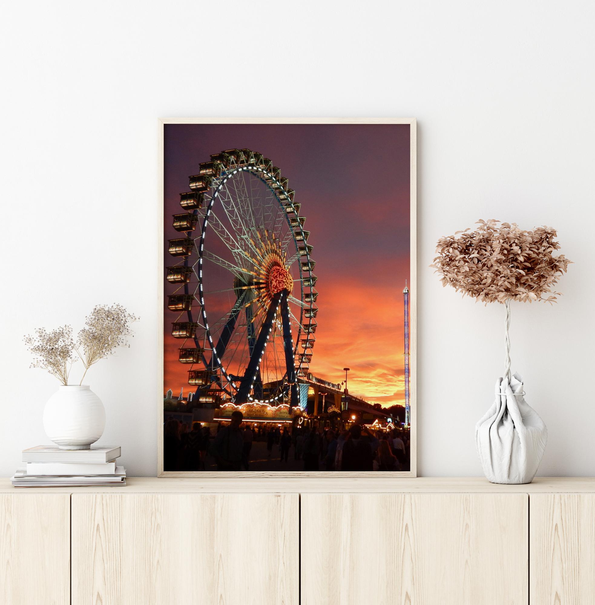 A stunning poster of a Ferris wheel at night. To the left, the wheel sits lit up and glowing. Below, crowds of people look at the wheel as the sun sets in a stunning orange and purple night sky. Bring some night-time drama to your walls with this poster.