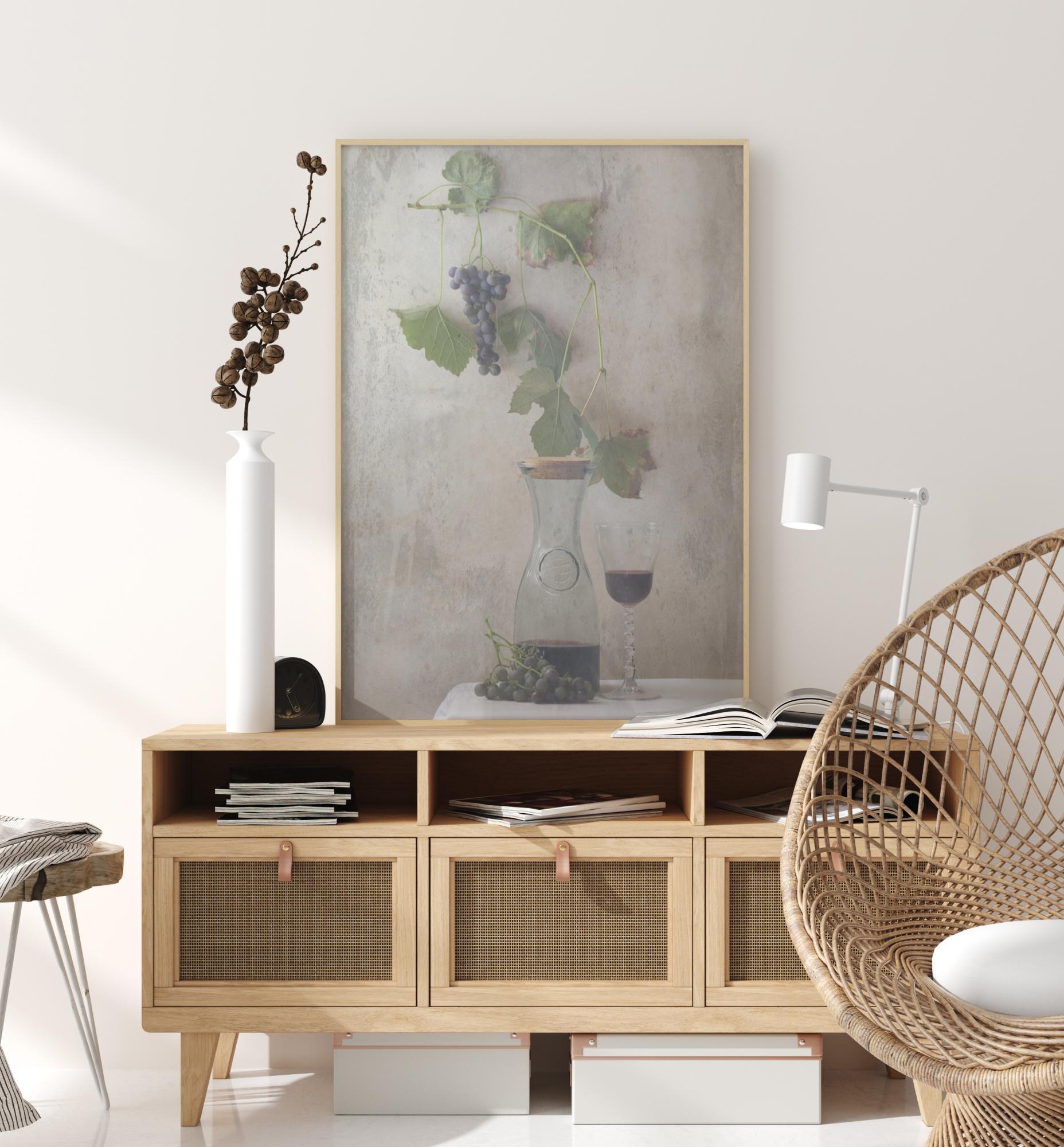 A still life poster of a carafe of home-made wine, wine glass and a small grape vine. The dark purple grapes and the green leaves are set to a simple grey wall which makes them stand out. Take yourself to a Roman villa when you bring this elegant, simple piece home.