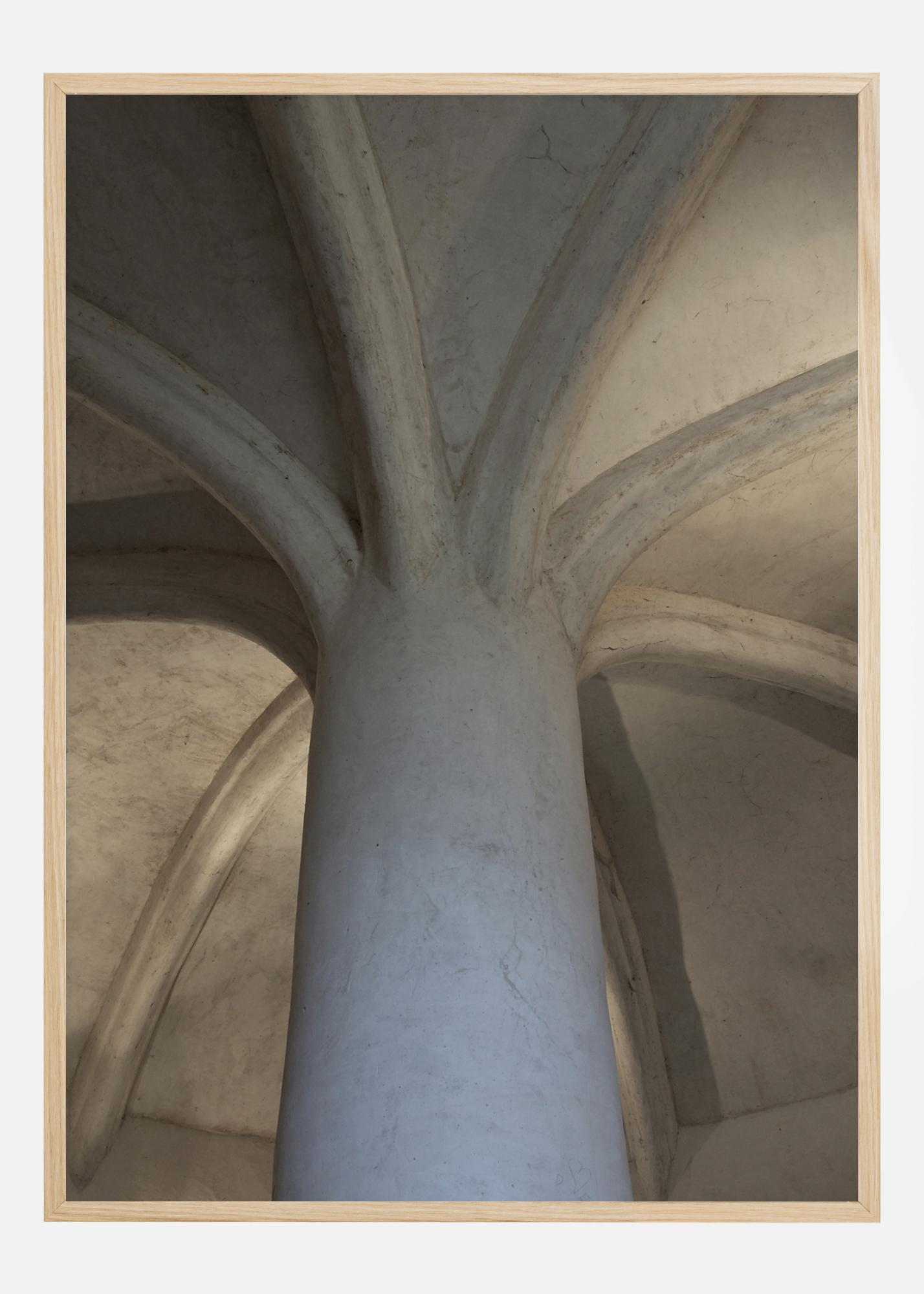An architectural poster of the inside of a chapel or church ceiling. A single column sits in the centre reaching toward the ceiling where eight vaults spread out like a flower. The cool stone creates a sense of grandeur which you can enjoy from home.