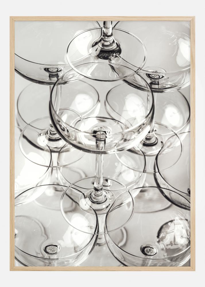 This elegant and sophisticated poster captures the beauty and clarity of a cascade of champagne flutes. The image depicts a close-up of the intricate structure of the glasses, where the light reflects and refracts through the transparent material, creating a dance of light and shadows. The richness of detail and the sheer precision in the composition highlight the delicate shapes of the glasses and the subtle nuances in the glass.