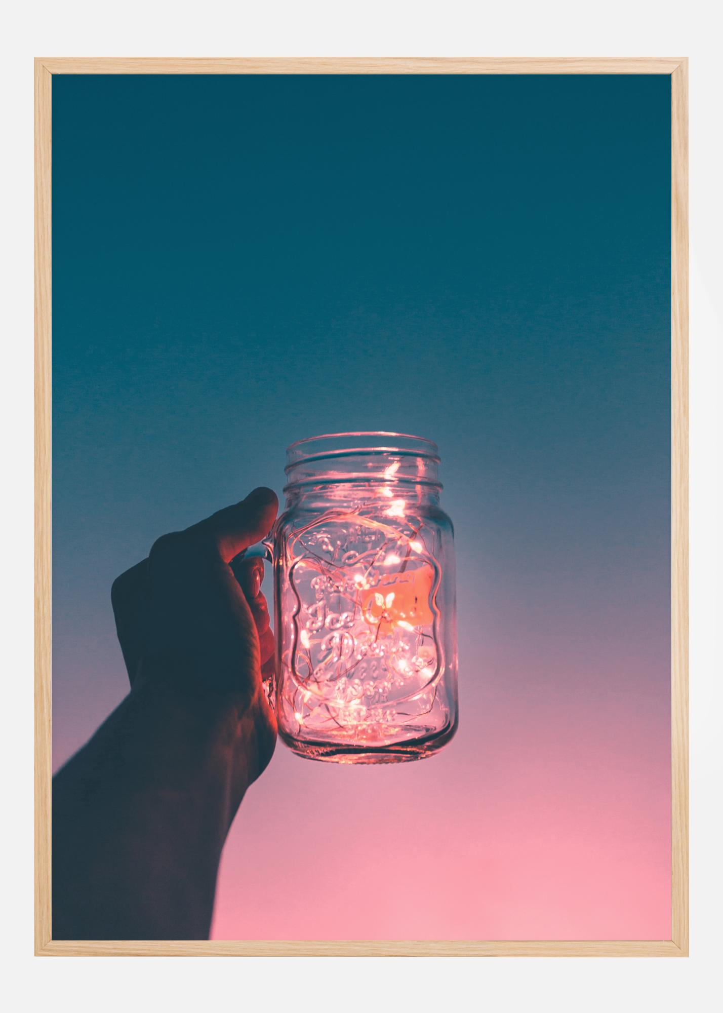 A friendly poster of a hand holding a mason jar mug with fairy lights inside. Enjoy this magical vibe as the glowing lights are held up to a soft blue and pink background giving this a true fantasy feel. Raise your glass to this image too and feel the uplifting spirit this poster brings.