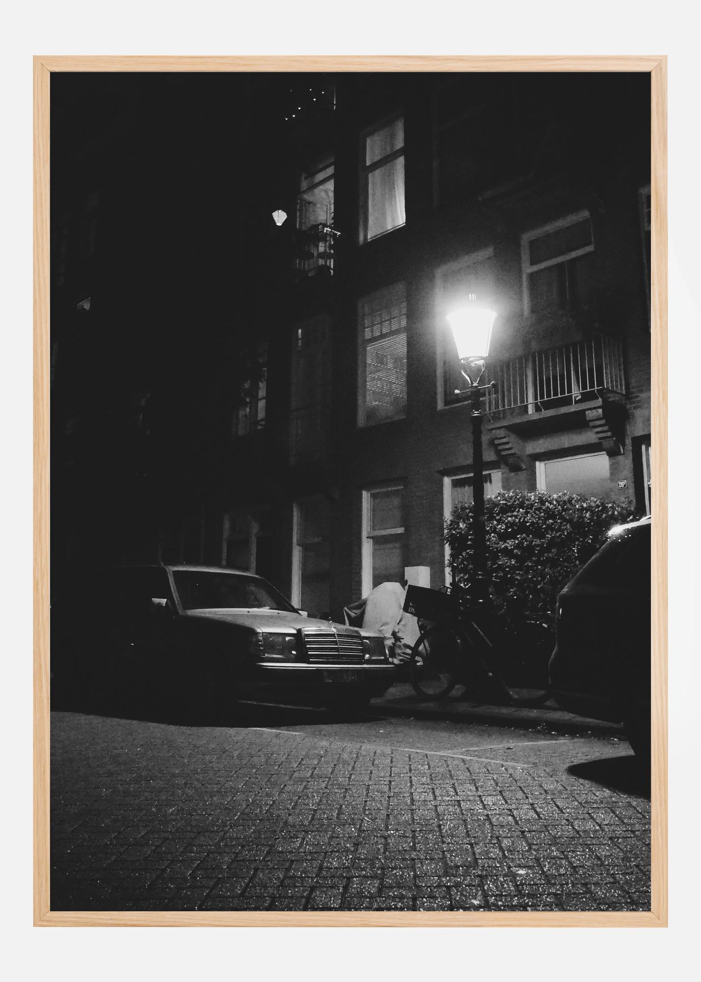 This captivating poster offers a glimpse of city life as night falls. A solitary streetlight bathes the sidewalk and parked cars in a soft, warm glow. The subjects are captured in a monochrome palette that enhances the contrasts and details in this tranquil cityscape. This print is perfect for introducing a sense of tranquility and reflection into any room, reminiscent of the calm moments in the otherwise bustling tempo of the city.