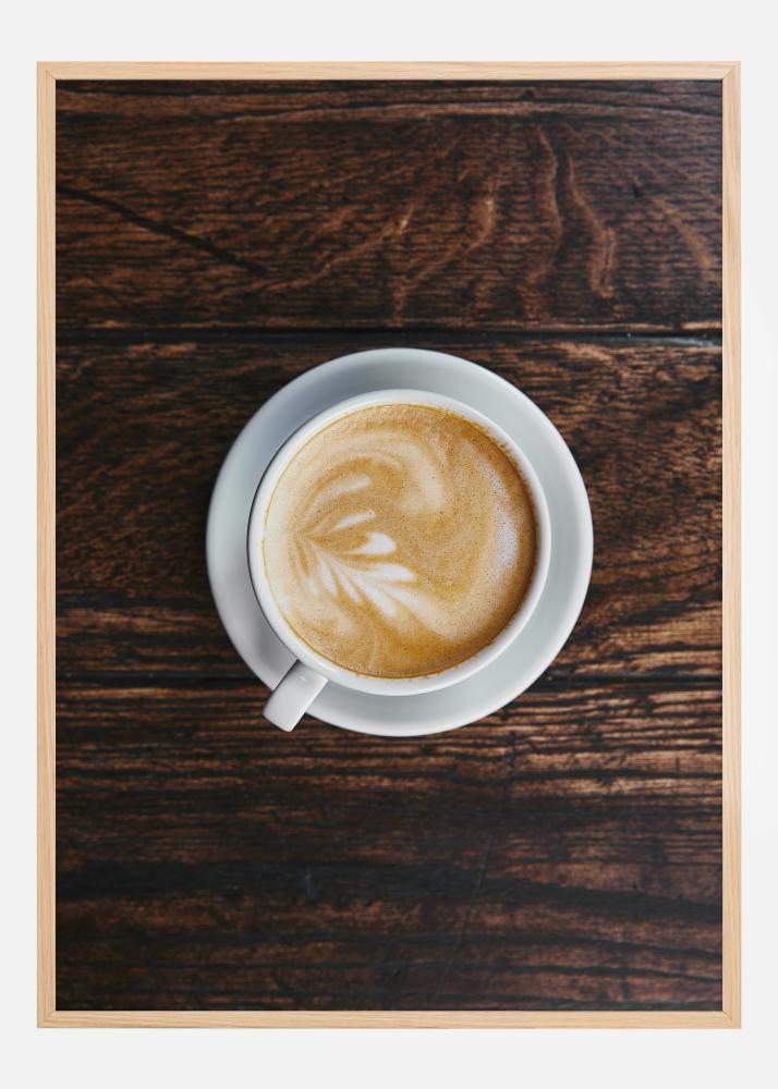 This welcoming and warming poster is a tribute to coffee culture and perfect for every coffee lover. A top view of a classic white coffee cup on a dark brown wooden surface conveys an immediate sense of comfort and a break from everyday life. The foam on the coffee has a fine art pattern, inviting a moment of relaxation and enjoyment.