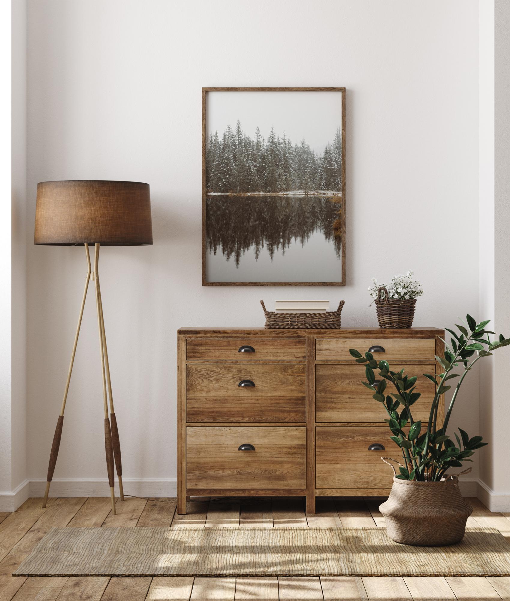 A Christmas poster with snow-capped fir trees sat on the edge of a lake. The fir trees cast perfect reflections in the lake to create a tranquil, yet chilly, scene. Bring winter into your home with this stunningly beautiful nature shot and be happy you're cosy indoors.