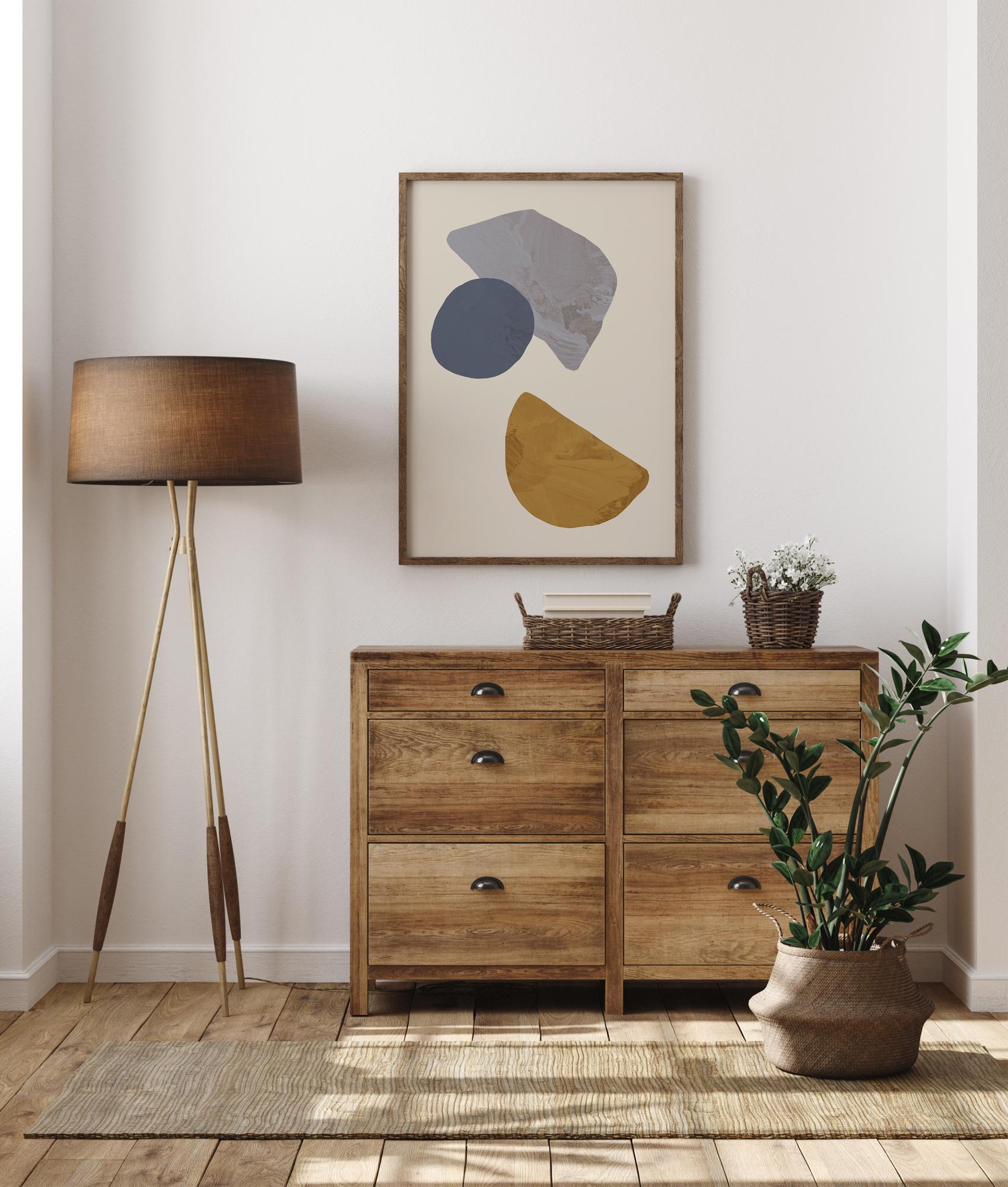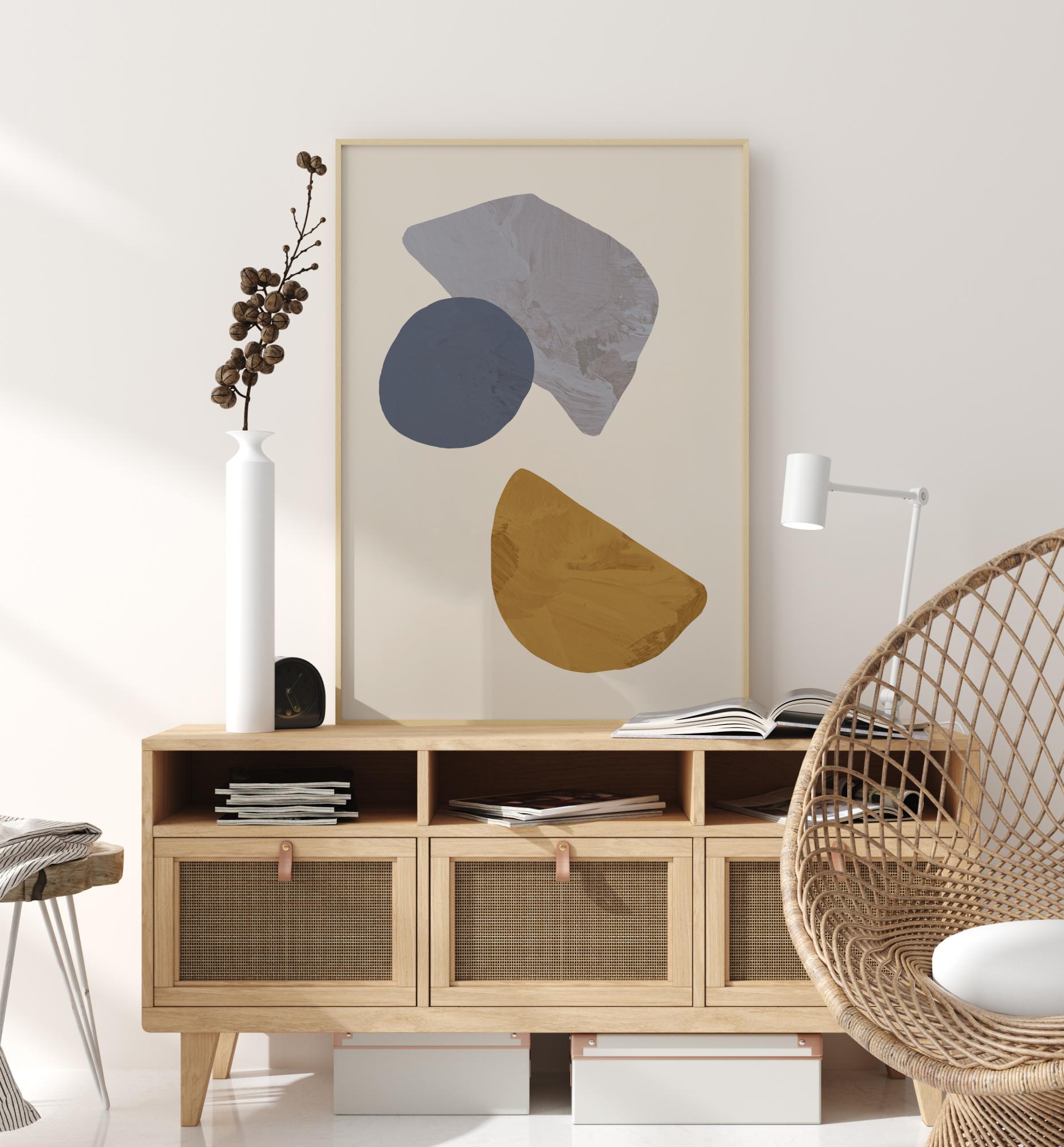 An abstract poster with three different shapes and colours. A brown semicircle sits at the base with a light blue bar in the centre of the image. Above, is a dark grey half circle, all on a white background. Add this to a plain wall for a great talking point.