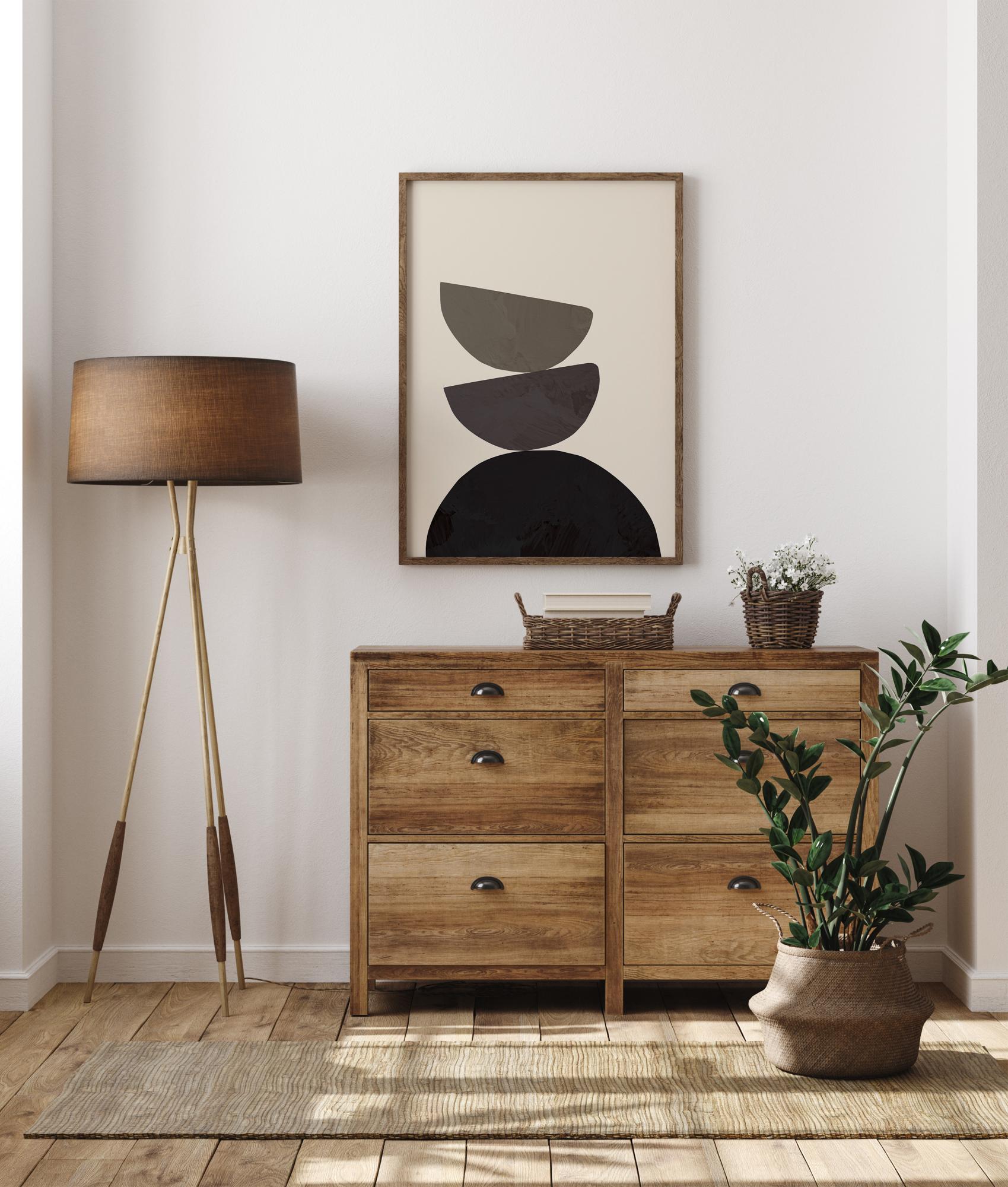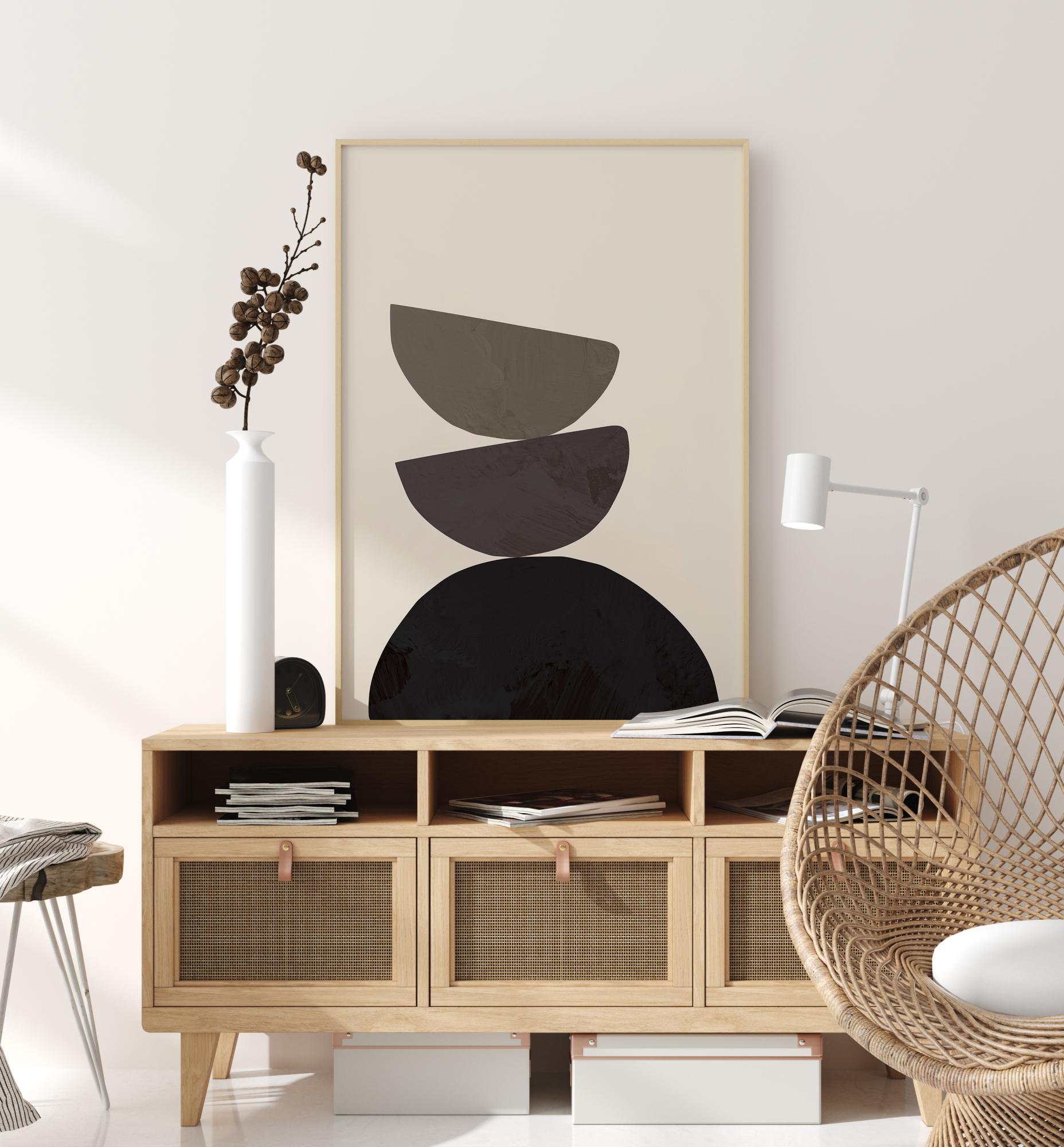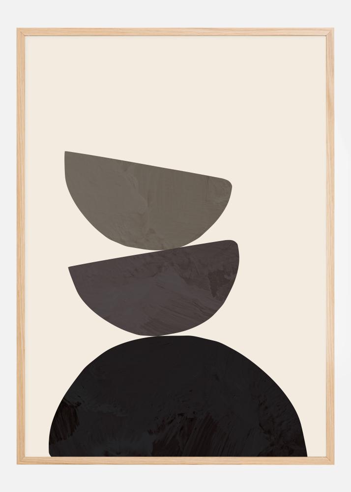 A stacked shape poster with three semicircles balanced on each other. At the base is a black half circle with two upturned semicircles in different grey tones on top. Enjoy the precariously balanced shapes when you add this to a bright colour wall.
