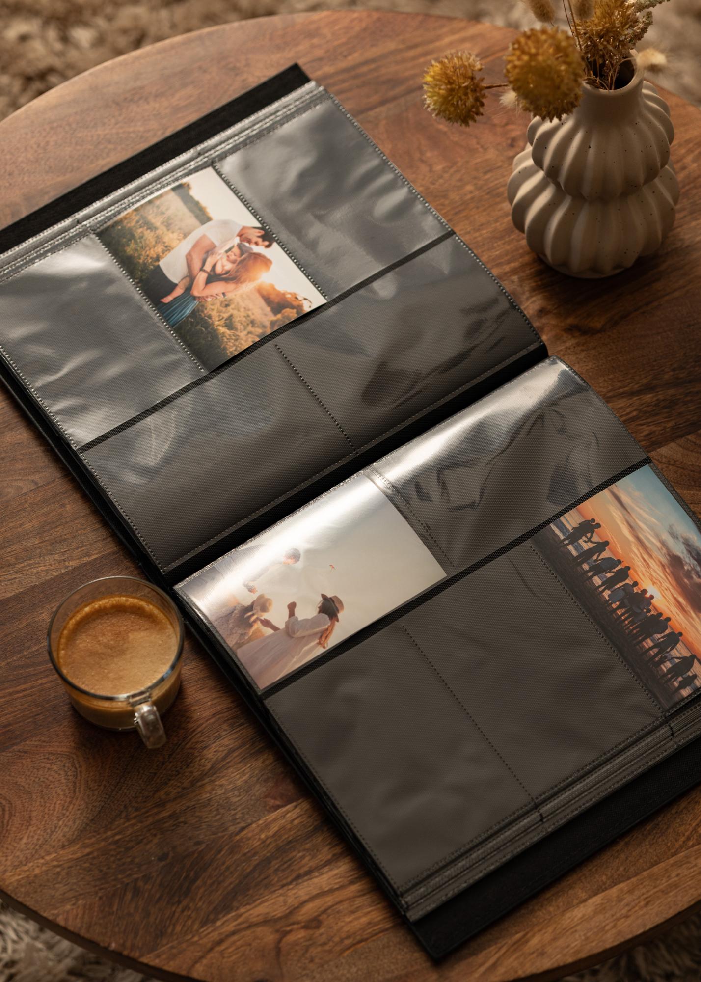 The unique aspect of this photo album is its practical photo pockets, which make it easy to mount and replace pictures without hassle. The photo orientation in the album is both landscape and portrait, giving you the flexibility to arrange your photos just as you like. The black pages create a beautiful contrast against your colorful photographs and highlight each photo in the best way.