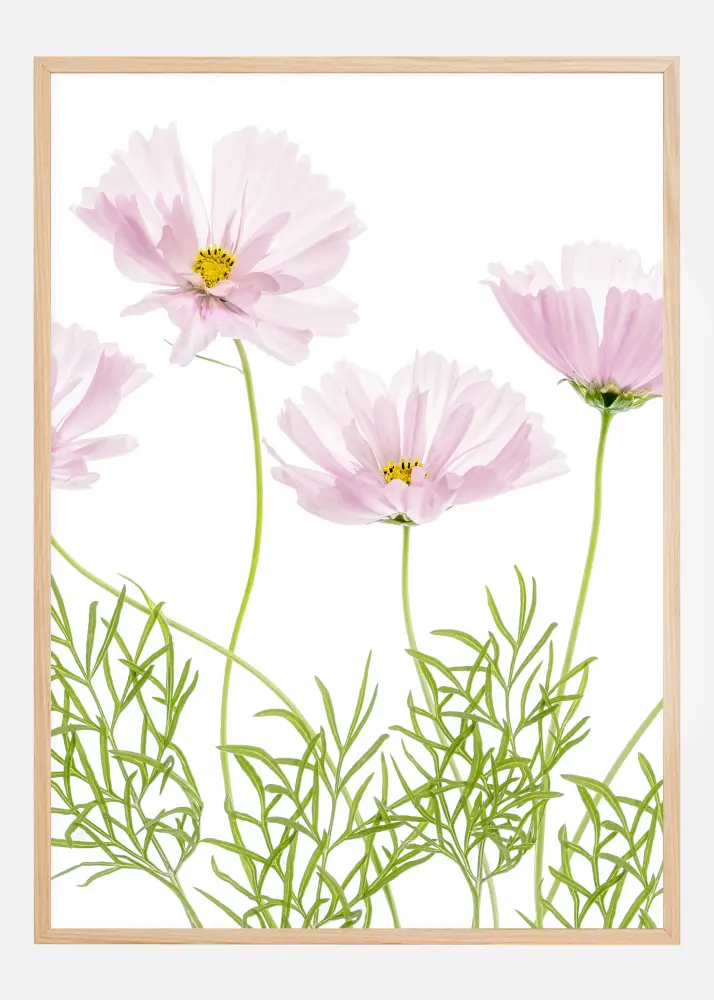 A print-style poster of Cosmos cupcake flowers. Each flower is a soft purple pink with a bright yellow centre. The simple green leaves draw the eye up to these dancing blooms. Get whimsical with this delightful print in your home.