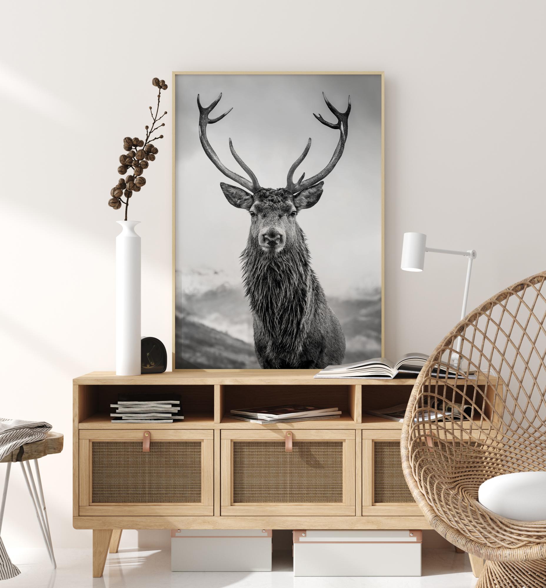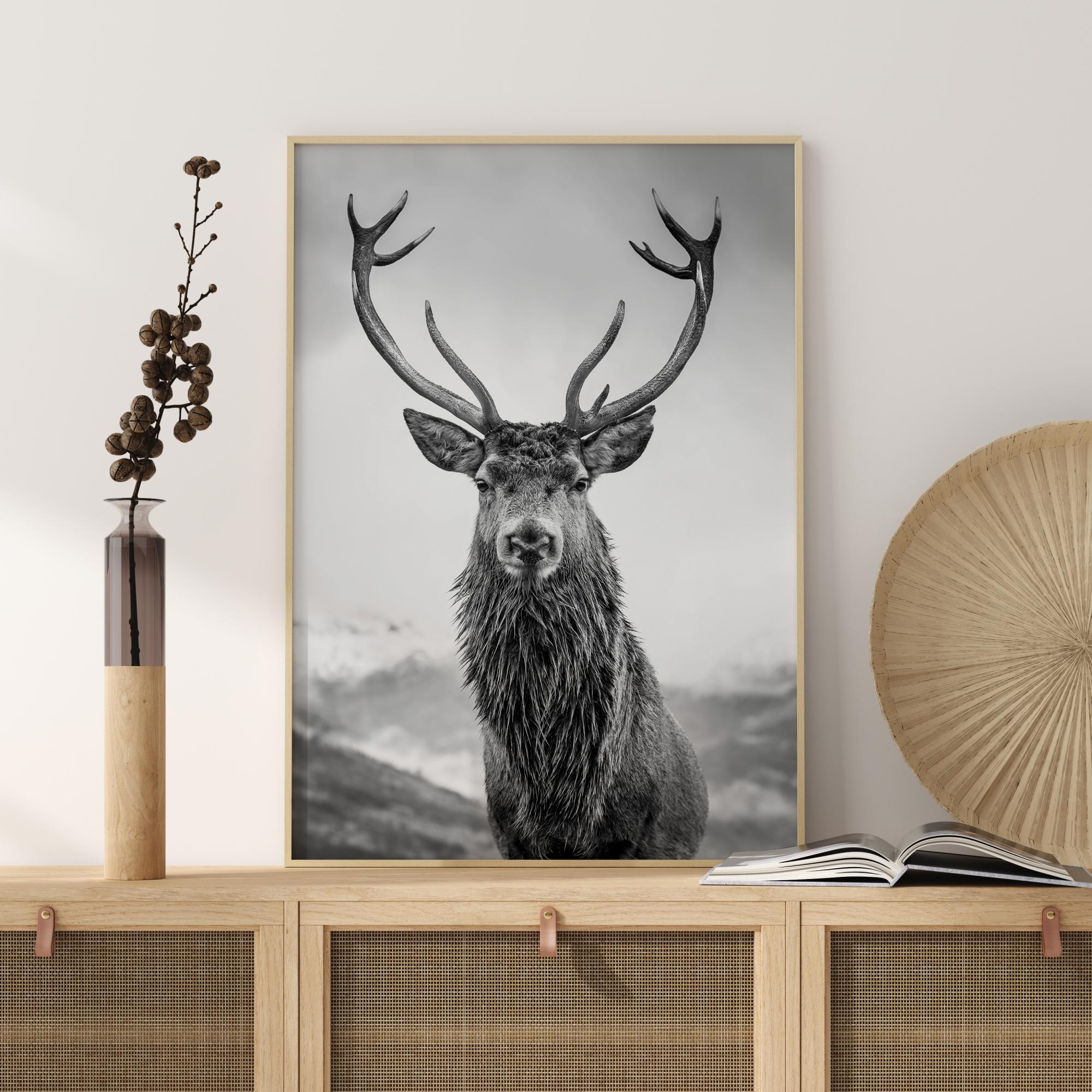 A regal poster of a red deer stag. The curious deer stares right into the camera with his antlers branching dramatically into the cloudy sky. Behind are rolling hills. This black and white print will really come to life on a green or blue wall.