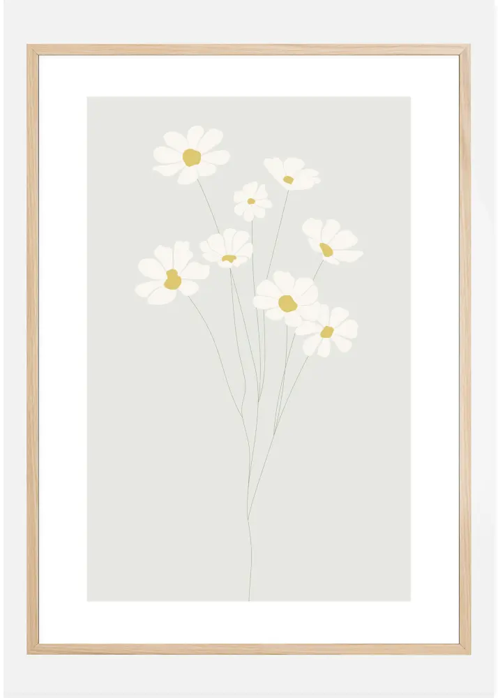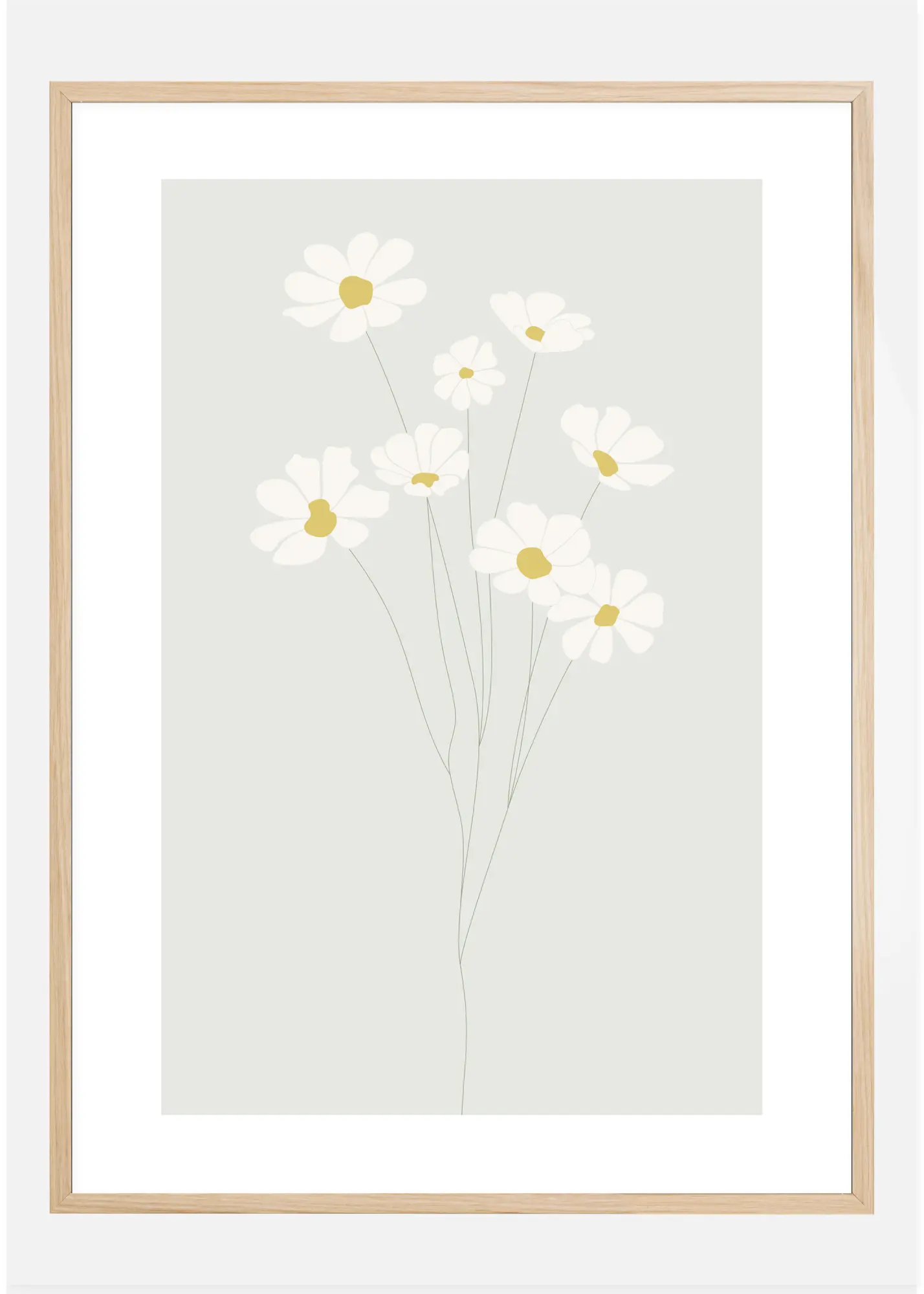 A subtle poster of a daisy print with a delicate look. The simple white and yellow flowers reach upward on slender stems and are set on a soft pale blue background. Add this to your children's bedroom for a soft, yet cute vibe for the kids.