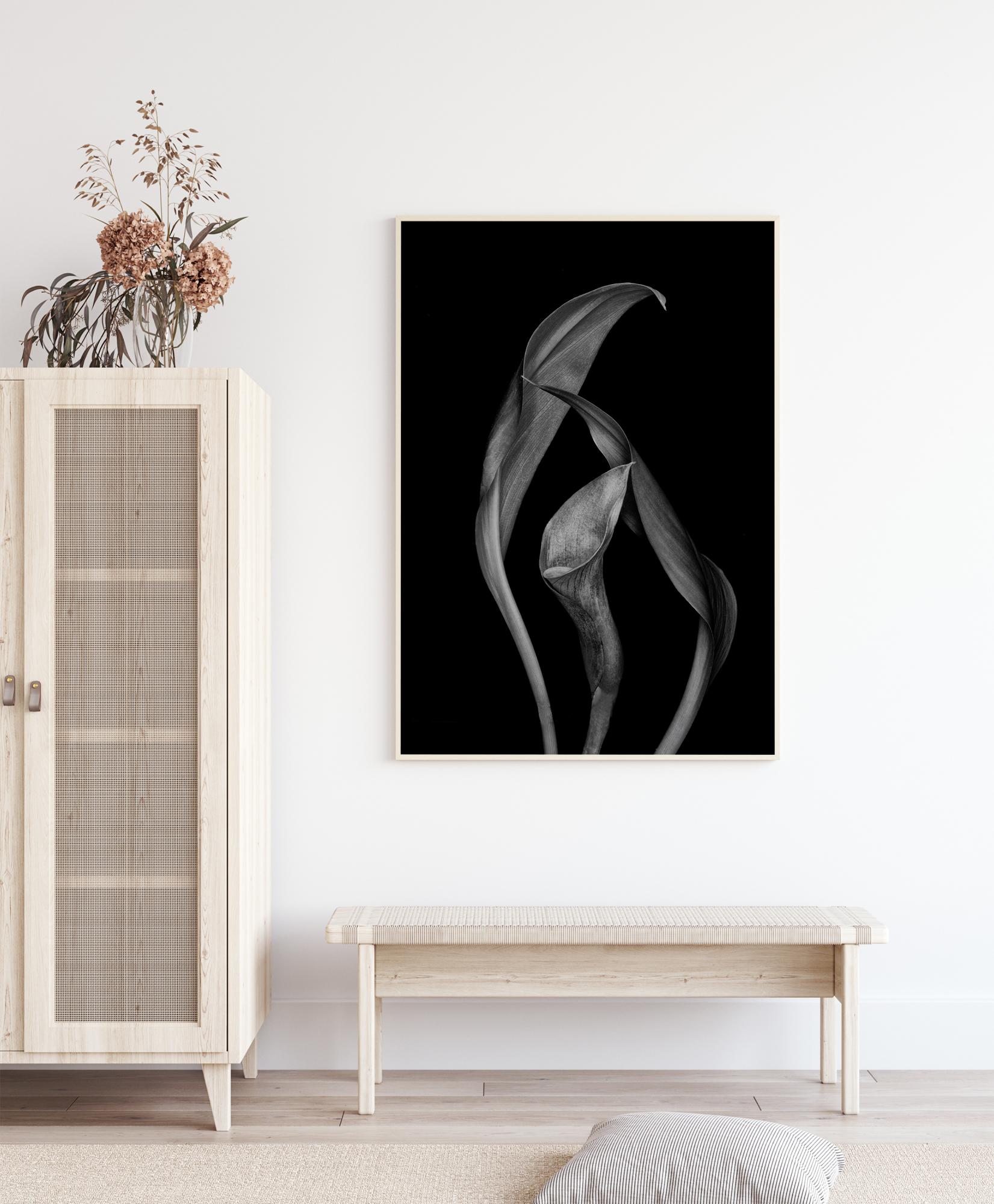 An unusual poster of dancing Calla lillies against a sharp black background. Add some drama to your home with this strange, yet compelling nature shot that is sure to inspire those who see it.