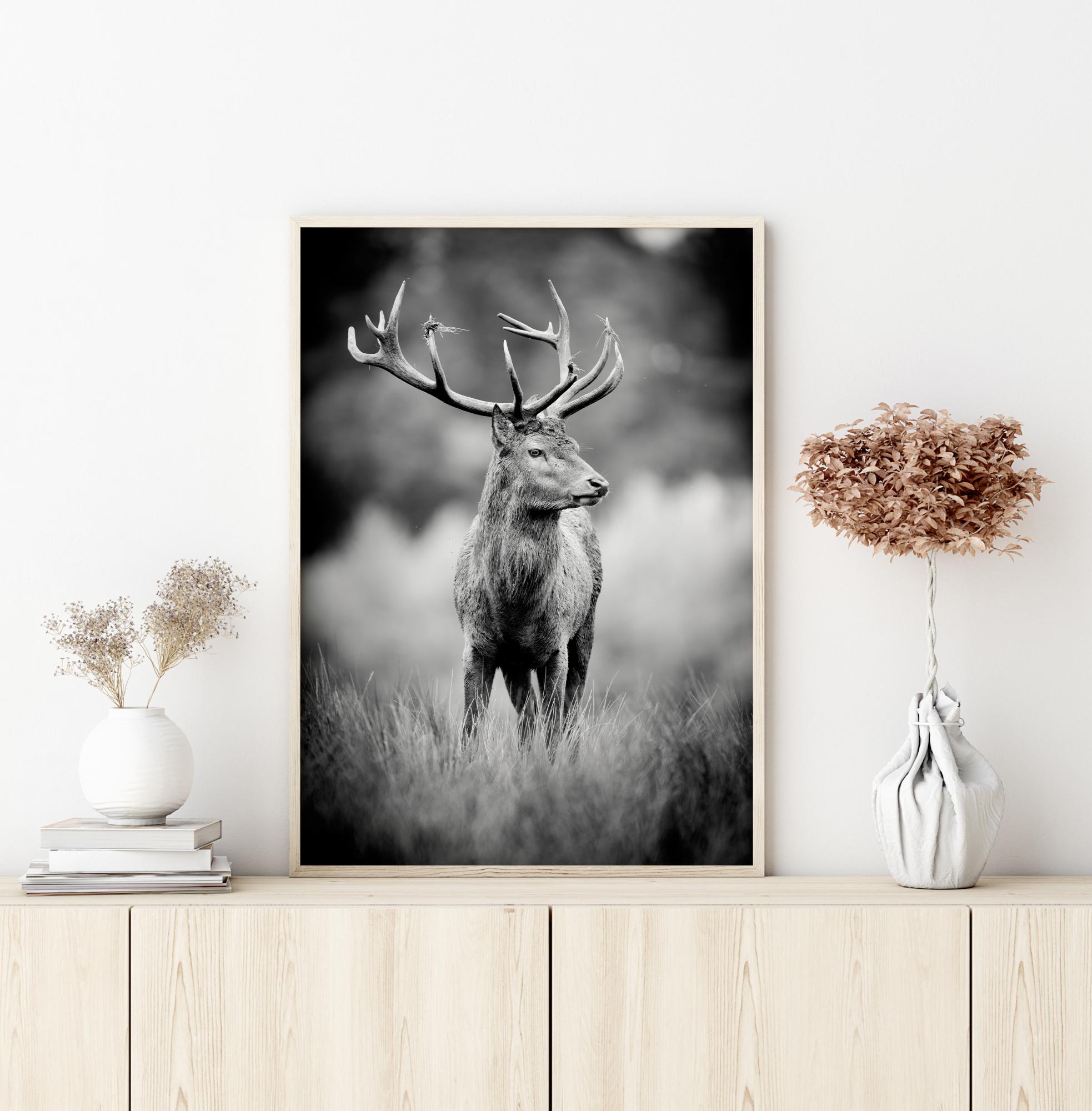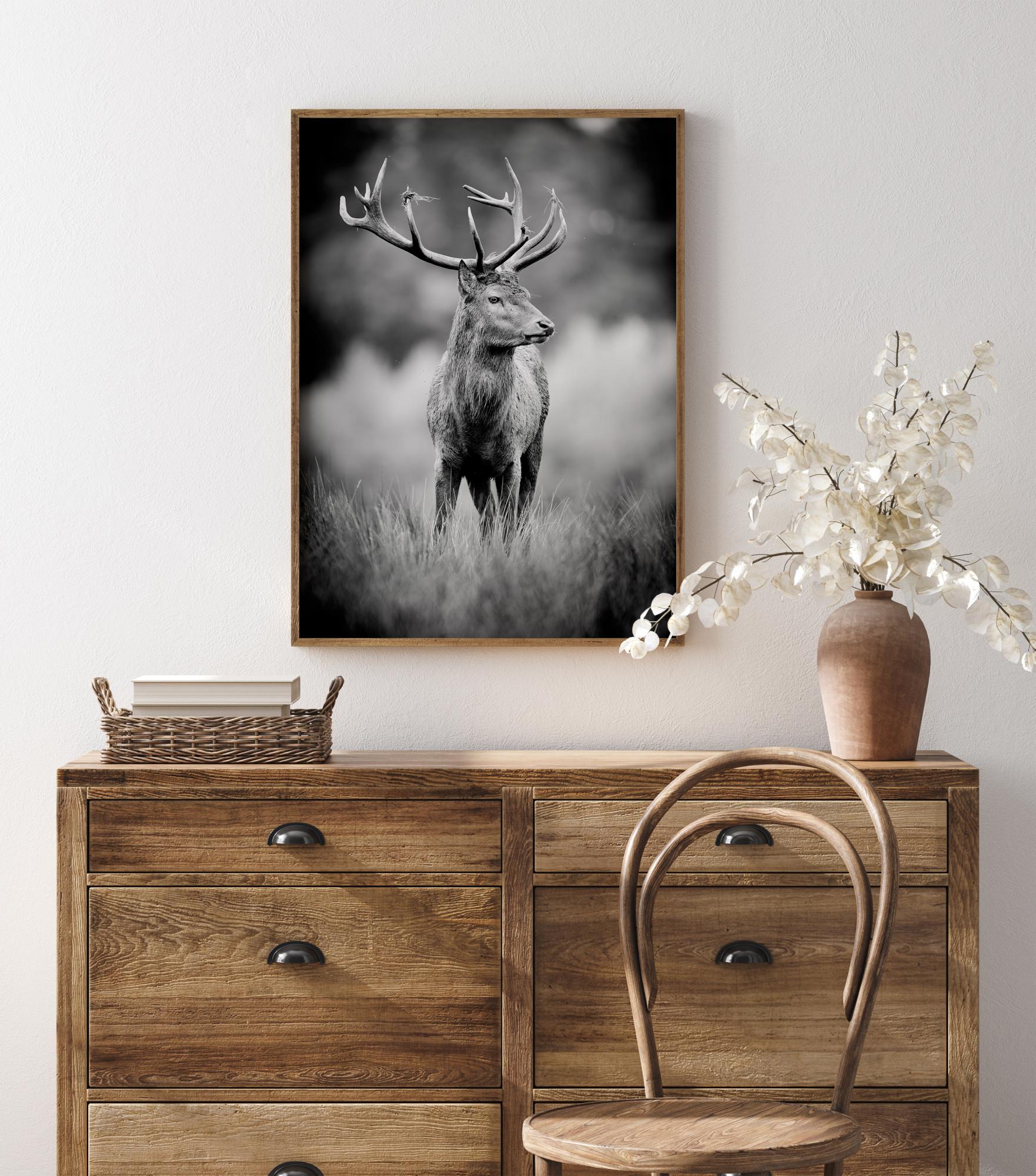 A wildlife poster of a stag with antlers in black and white. The vignette makes this feel like you are viewing him through binoculars from afar as you would in the wild, making this scene even more special. His turned head means he's looking back at you drawing you in.