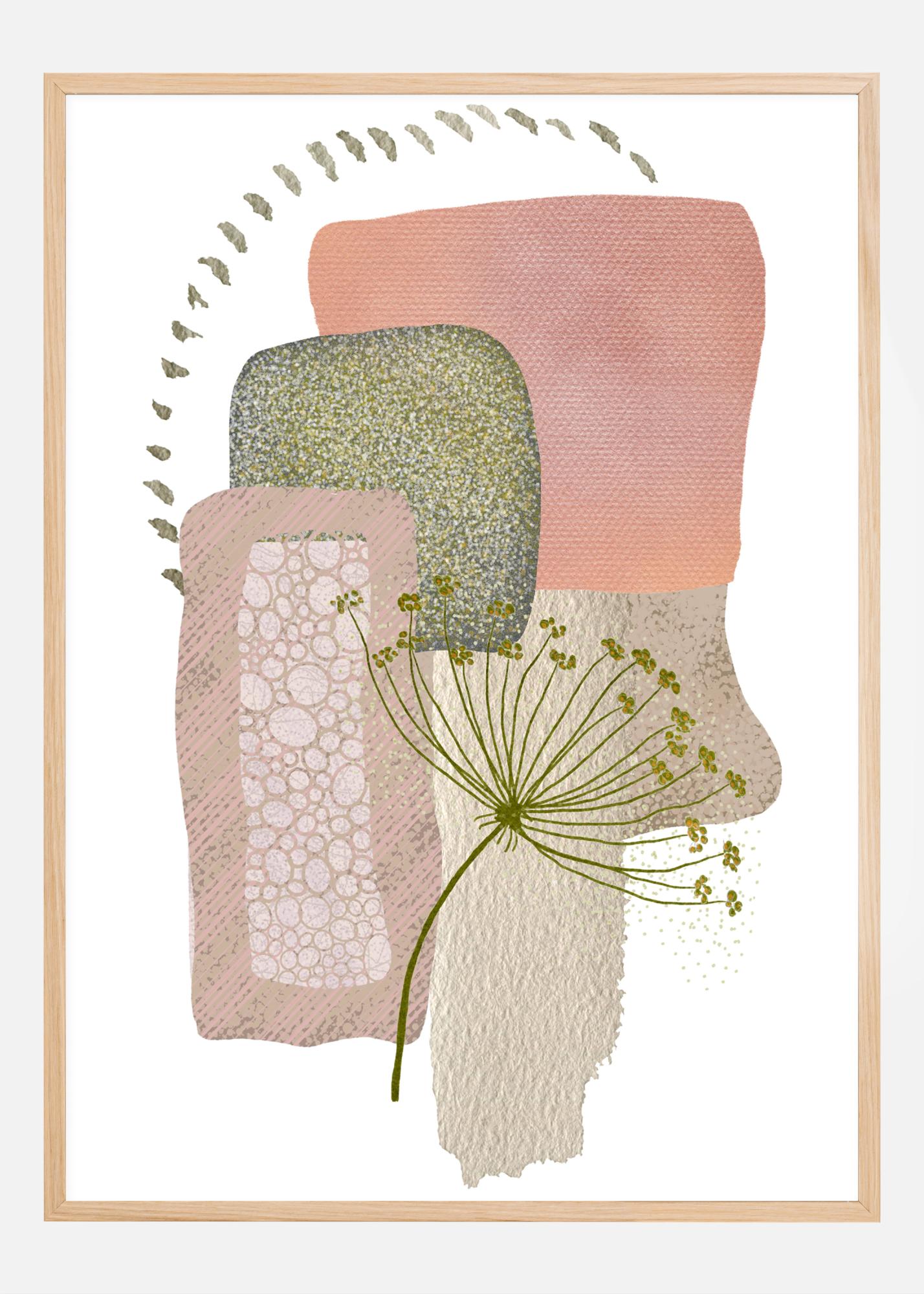 This poster evokes a sense of calm and beauty through its relaxed combination of soft tones and abstract shapes. Central to the composition is a delicate flower stem reaching upwards, with its small green buds lightened by a thin, graceful stem. The overlays of texture and color create a depth and interest that captures the eye and invites longer contemplation. With its soothing pink and green palette, this art print conveys a sense of nature's tranquility and simplicity, making it a beautiful addition to any home.