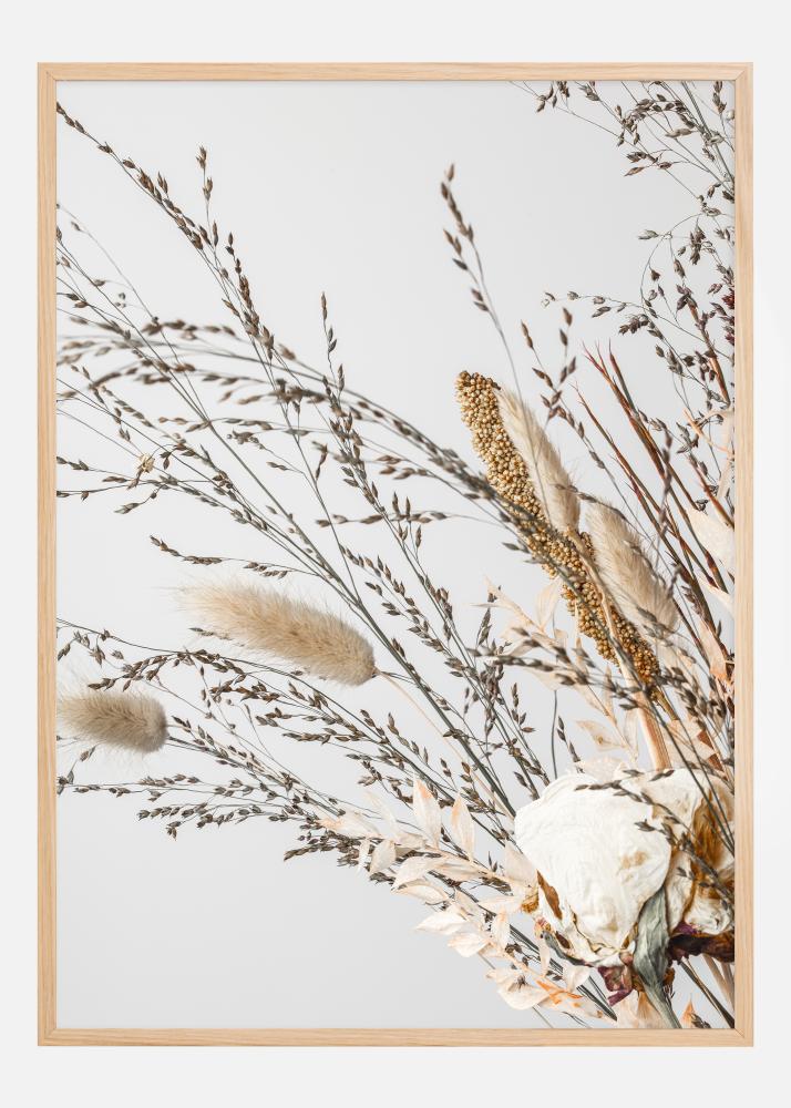 This poster is a celebration of nature's silent elegance, depicting a varied arrangement of dried plants. The natural composition is full of fine lines and organic shapes, from the swaying grass blades to the robust heads and the subtly toned leaves. The dried plants' brown-beige palette against the clean white background gives a sense of warmth and nature captured in stillness.
