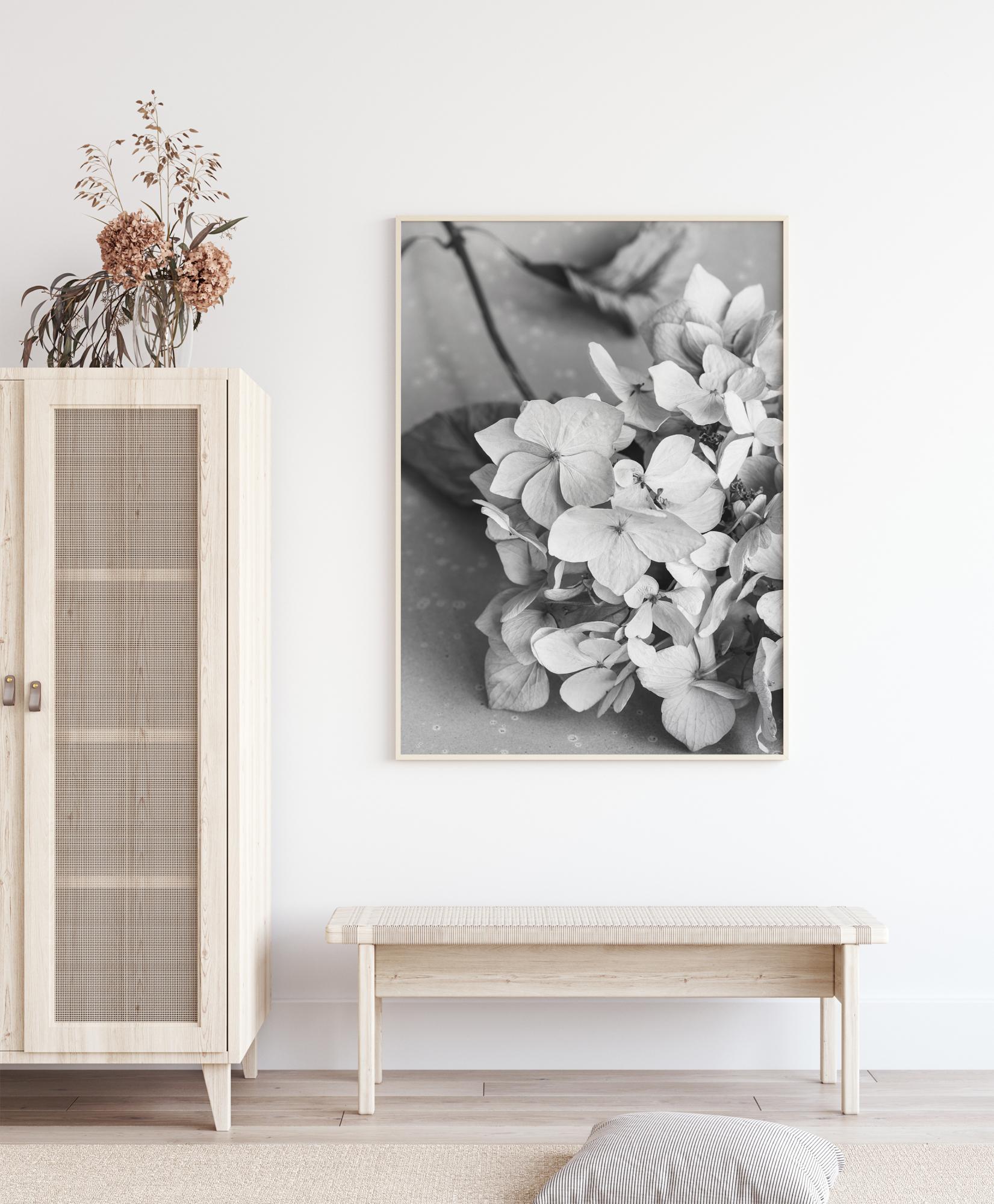 A flower poster featuring a number of dried white flowers all set out on a table top. The large white petals look clean and neat and contrast with the dried curling leaves below. Match this with a bold colour wall to give the illusion of colour in those petals and make this poster pop.