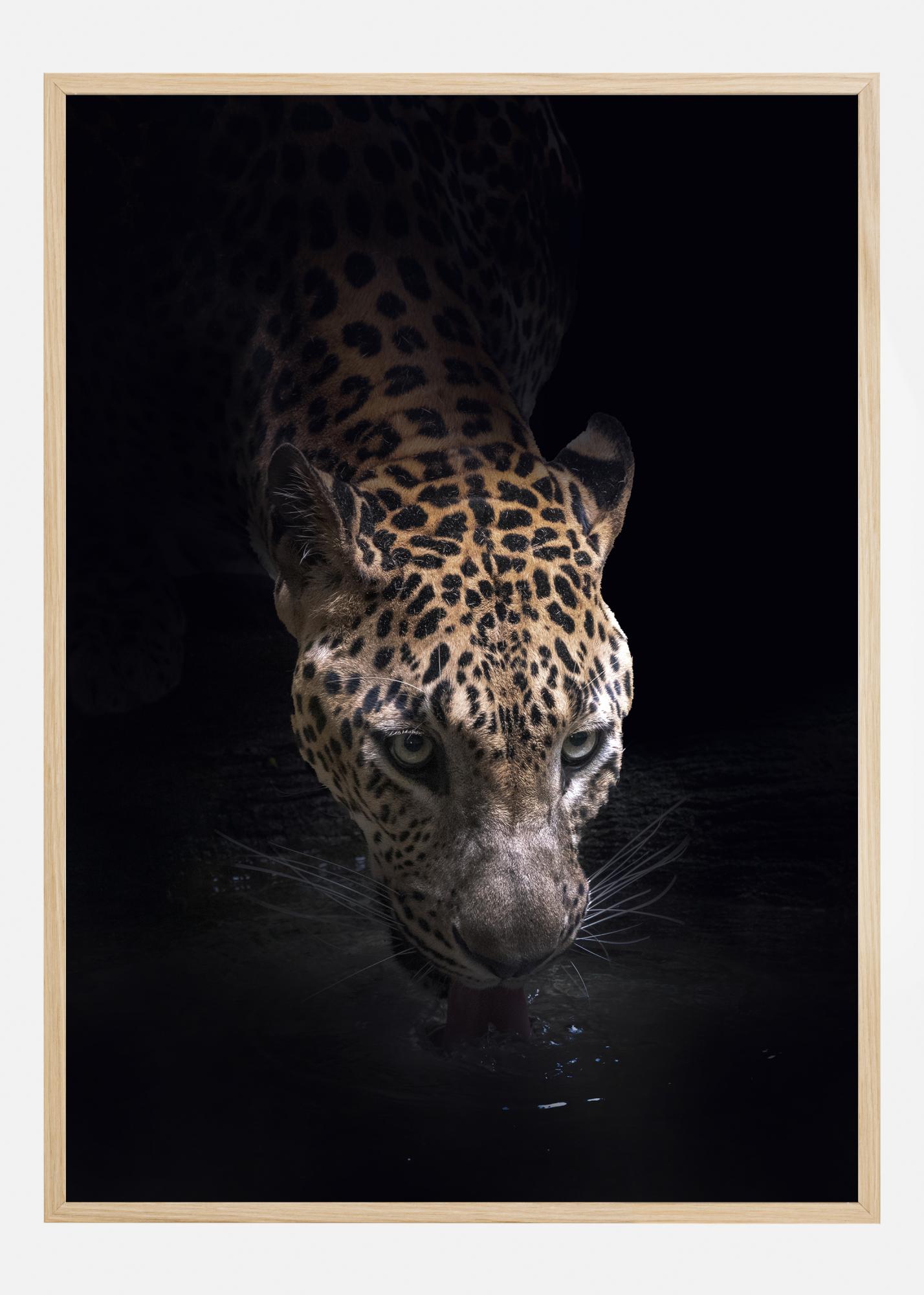 This dramatic poster captures a leopard in an intimate moment as it quietly drinks water, a powerful moment of wild nature caught in time. The black background accentuates the golden color of its magnificent fur and the distinctive spots, creating an almost three-dimensional effect. The leopard is facing the viewer with a gaze filled with the concentration and presence of a wild animal, providing an immediate connection between animal and human.