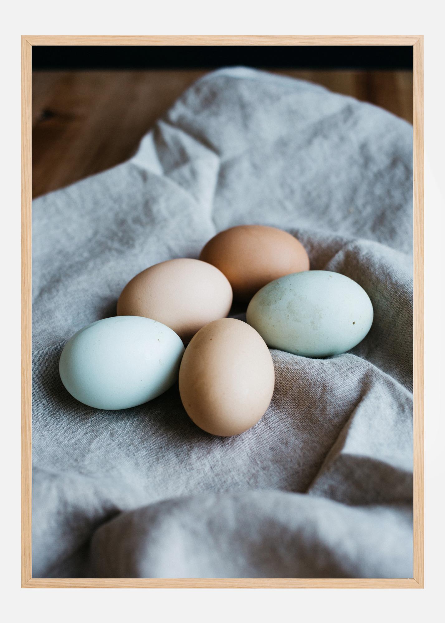 A still life poster of five eggs on a white cloth on the table. The eggs are different brown and white colours and look freshly laid. The warm tones create a rustic feel where you can appreciate that natural living vibe. Perfect for a country kitchen environment.