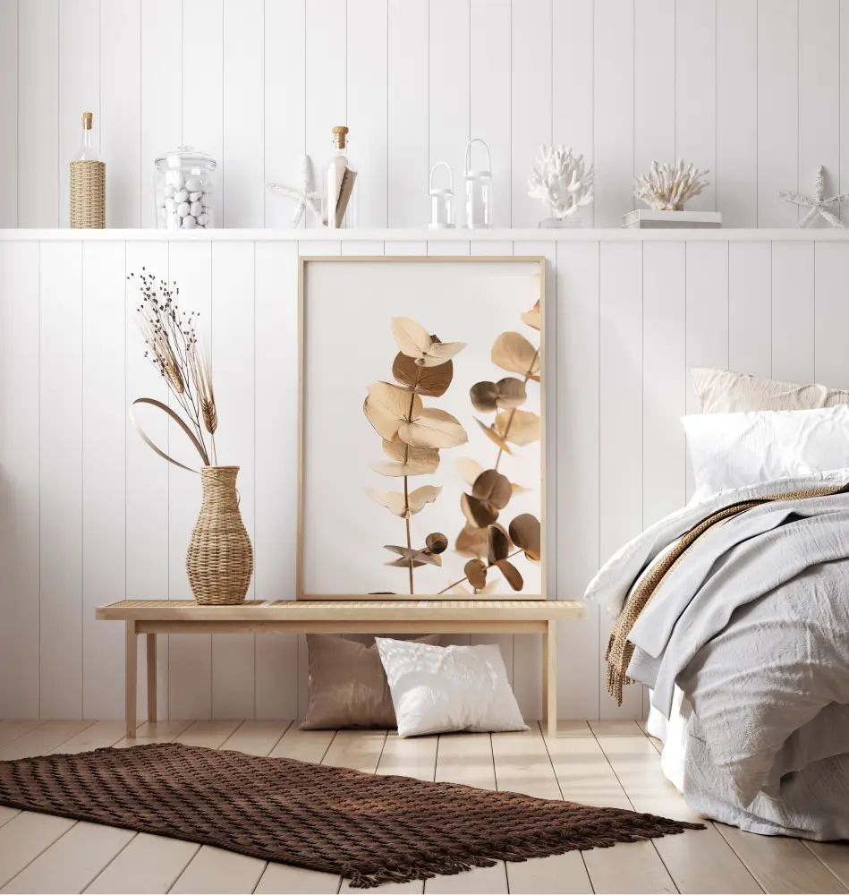 A strong gold poster of fronds of golden eucalyptus leaves. Three branches of these leaves reach up through the piece glinting and glittering in a stunning way. The gold can be matched with some dark cream walls for a really stunning design.