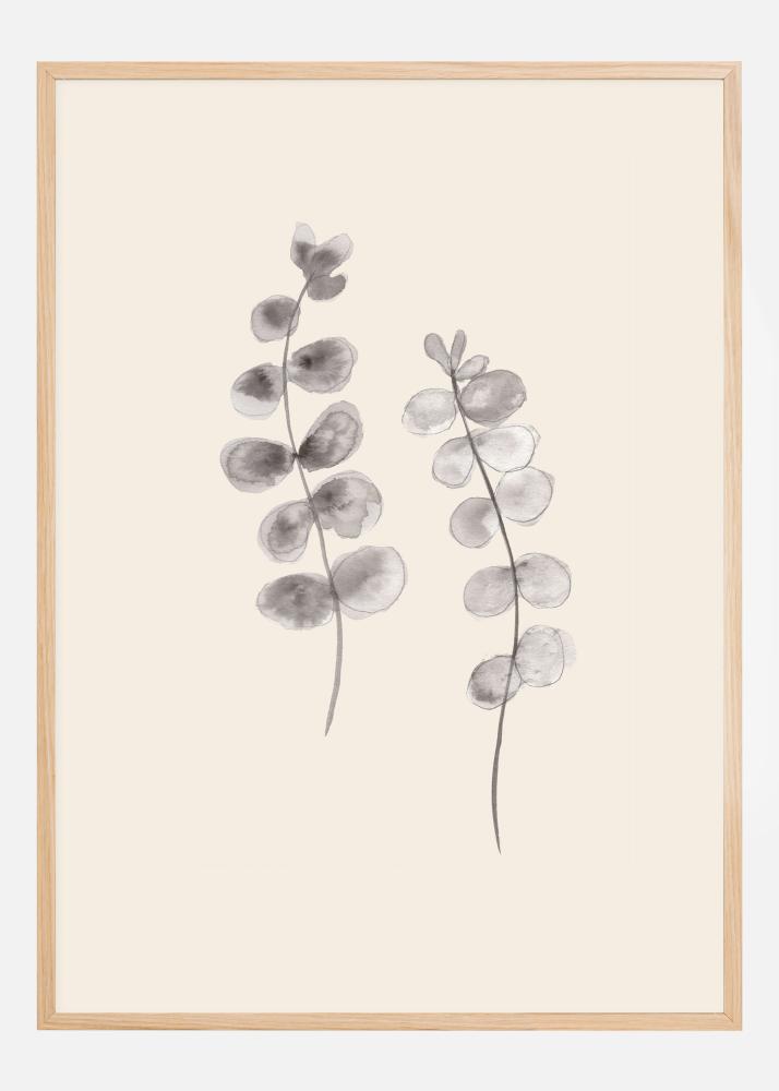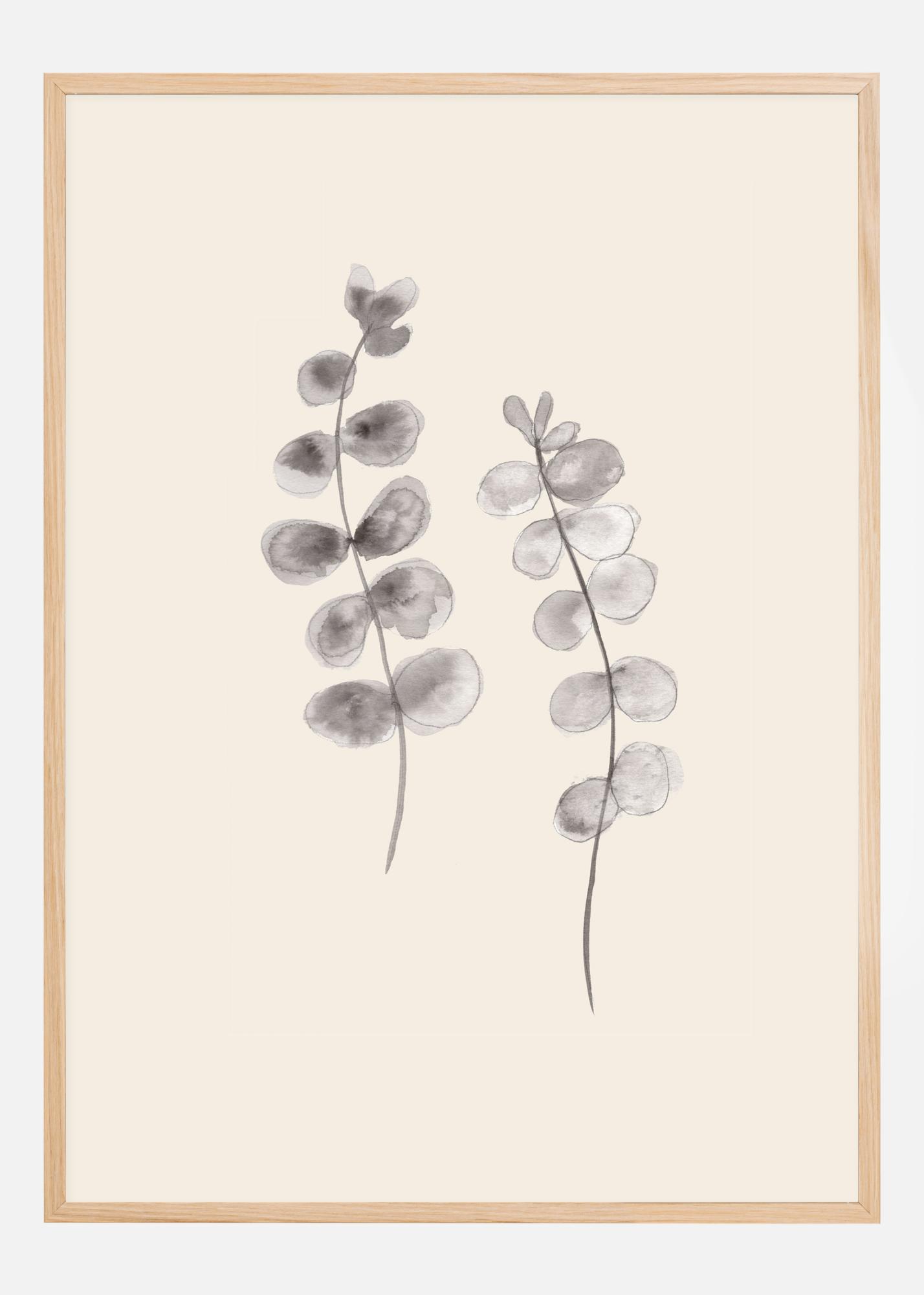 A botanical poster of two grey fronds of eucalyptus leaves. In the centre of a white background are two grey painted branches with eucalyptus leaves. They undulate together creating a soft curve leading the eye up through the poster. Bring this leafy dance home for a soothing vibe.