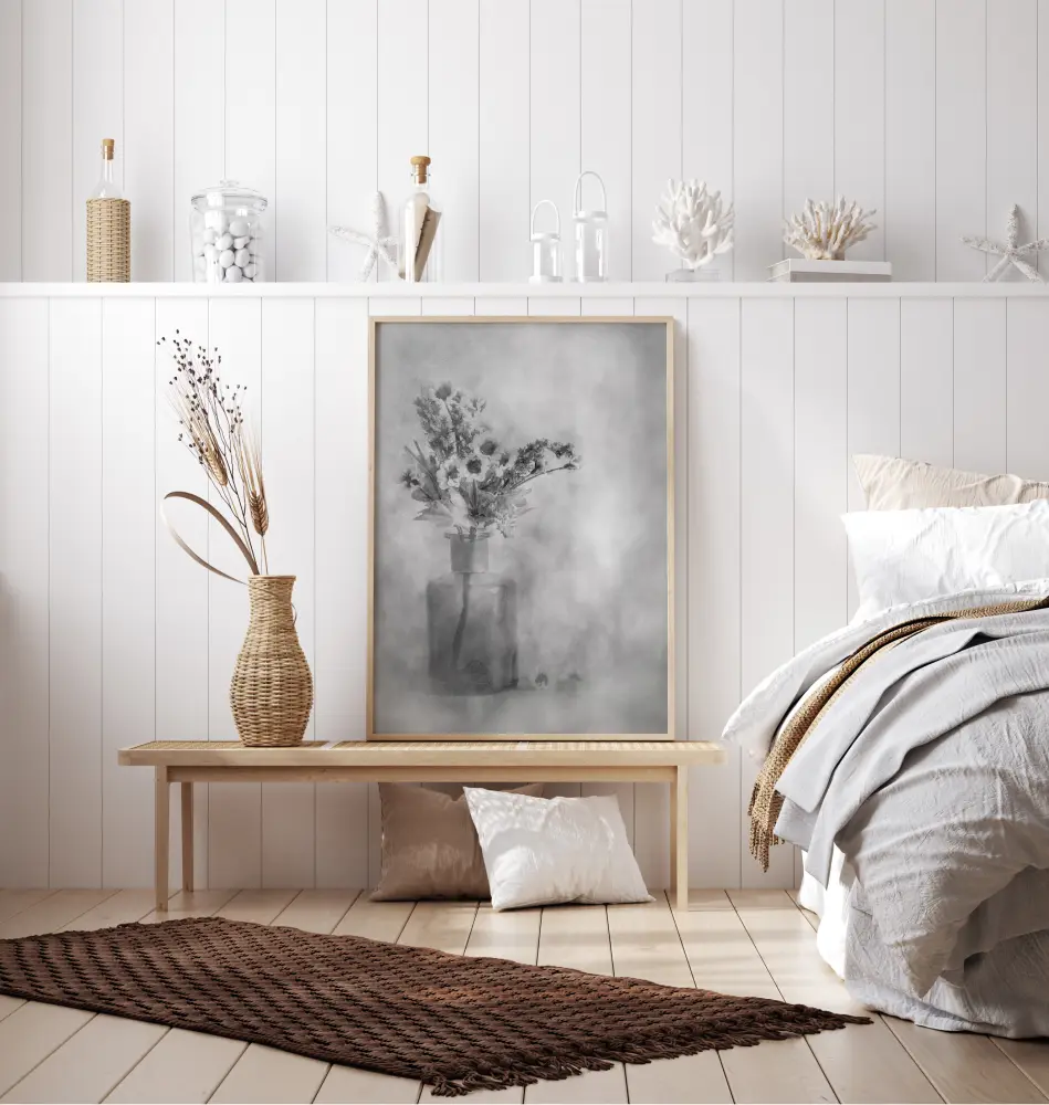 A romantic poster of a soft still life with a vase and flowers. This grey tonal piece has a gentle painterly feel with minimal contrast between the different elements in the image. Imagine yourself settling in to paint this tranquil scene when you hang this on a pastel wall at home.