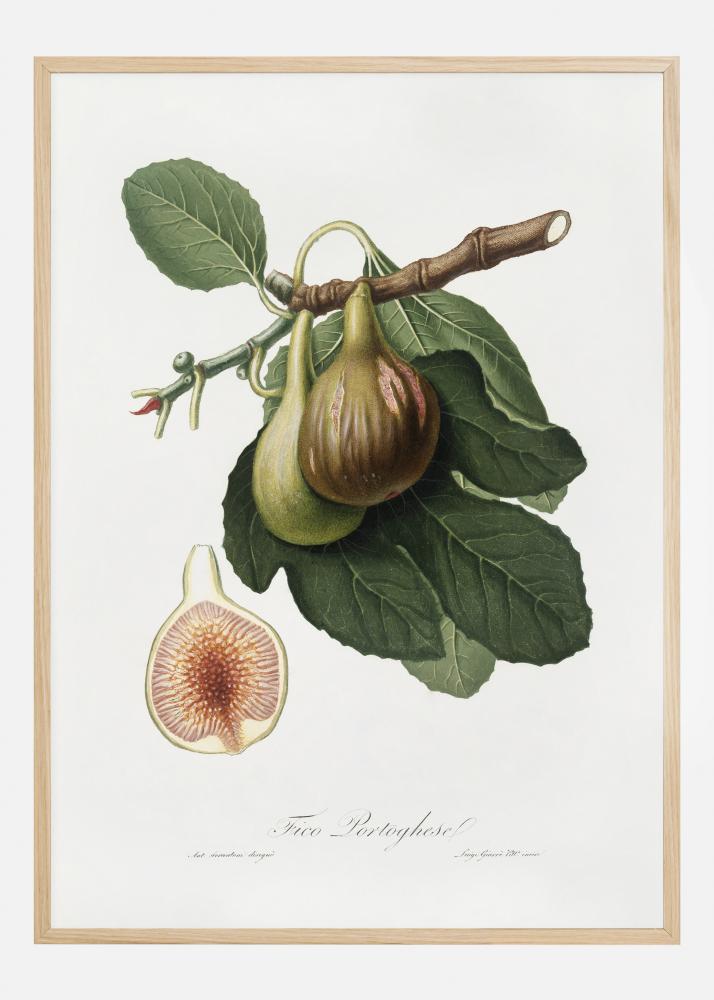 A botanical poster of an illustration of figs. Go old-school when you hang this simple, yet detailed, drawing on your wall. The watercolour paining captures all the details even giving you a cross-section of the fig and the seeds inside.