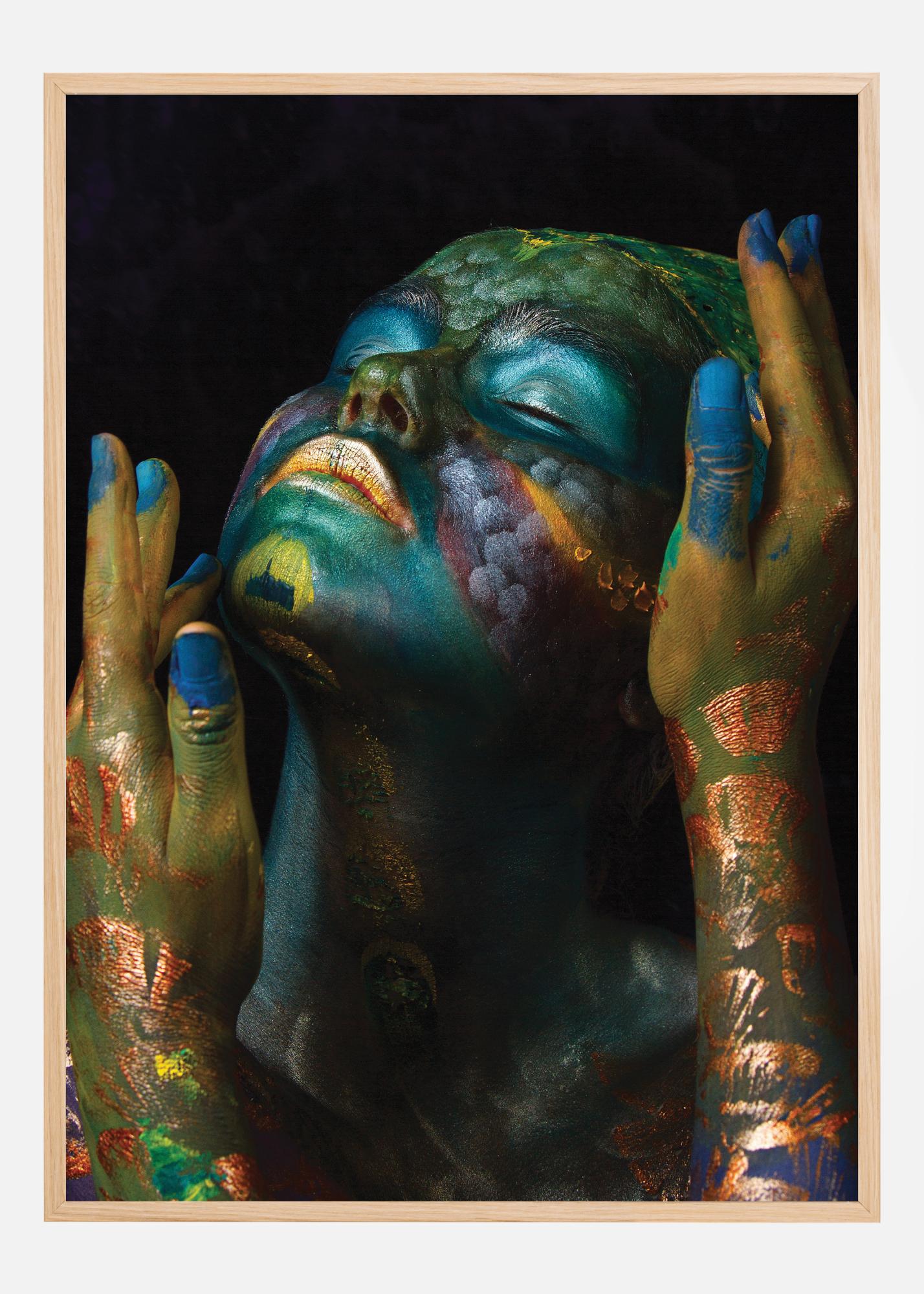 A multi-coloured portrait poster of a woman tilting her head back, framing her face with her hands. She's covered in glowing bright paints creating a beautiful melange of riotous colour. Pick one of the colours in the painting and match it on your wall for added brilliance.