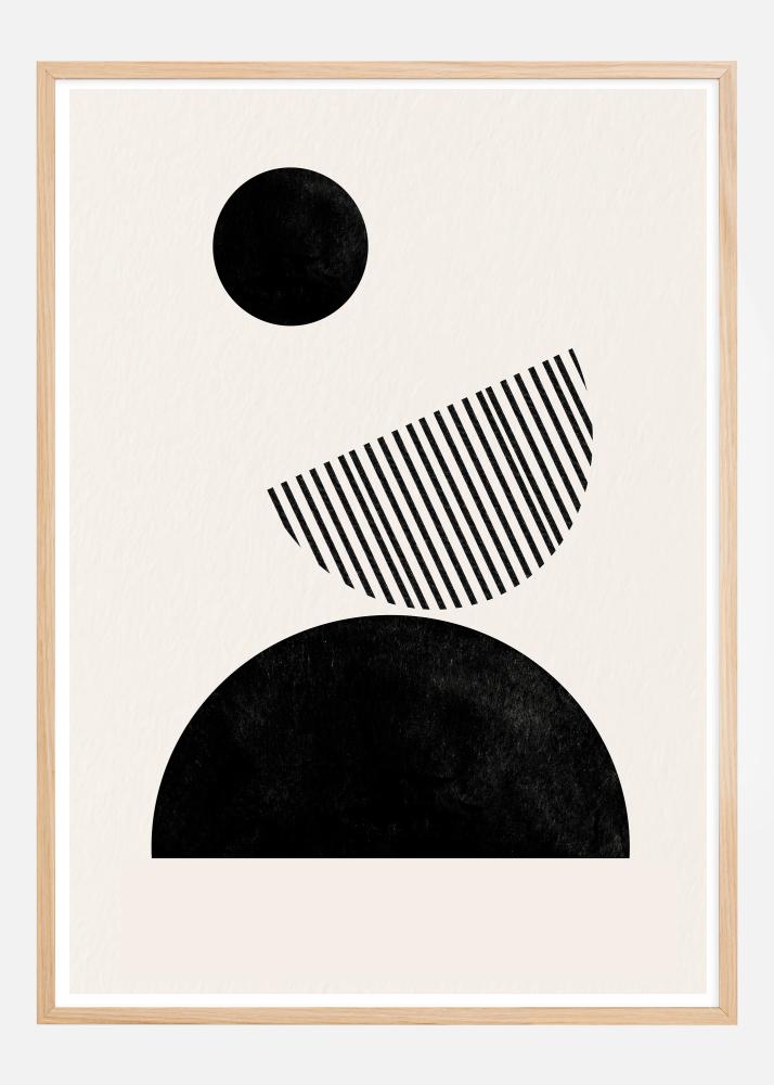 This artistic poster is characterized by its playful use of geometric shapes and textures to create a balanced and modern composition. A large black circle sits at the top, followed by a diagonally ribbed half-circle and a solid black semicircle at the base. Each element contributes to a sense of movement and dynamism, while the uniform color scheme creates a sense of coherence and simplicity.