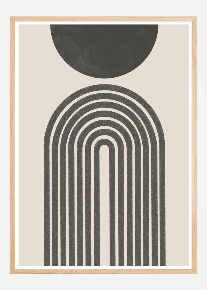 This artistic poster depicts a fusion of geometric precision and organic softness. The upper part of the design consists of a black semicircle that emits a calming presence against the warm, neutral background. Below this, a series of black arches rise to form a portal-like shape harmoniously, creating a contrast between the strict geometry and the abstract curves of the black circle. The simple color scheme with black against an off-white background gives a modern and elegant impression, perfect for the contemporary home or office.