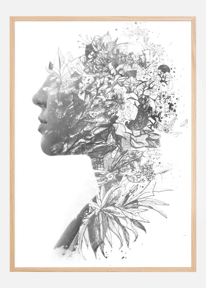 This artistic poster combines a woman's profile with a detailed and intricate illustration of flowers and plants, creating a fascinating fusion of the human form and the subtle details of nature. The black and white color scheme gives a timeless feel and highlights the subtle texture and complexity in both the human figure and the floral motifs.