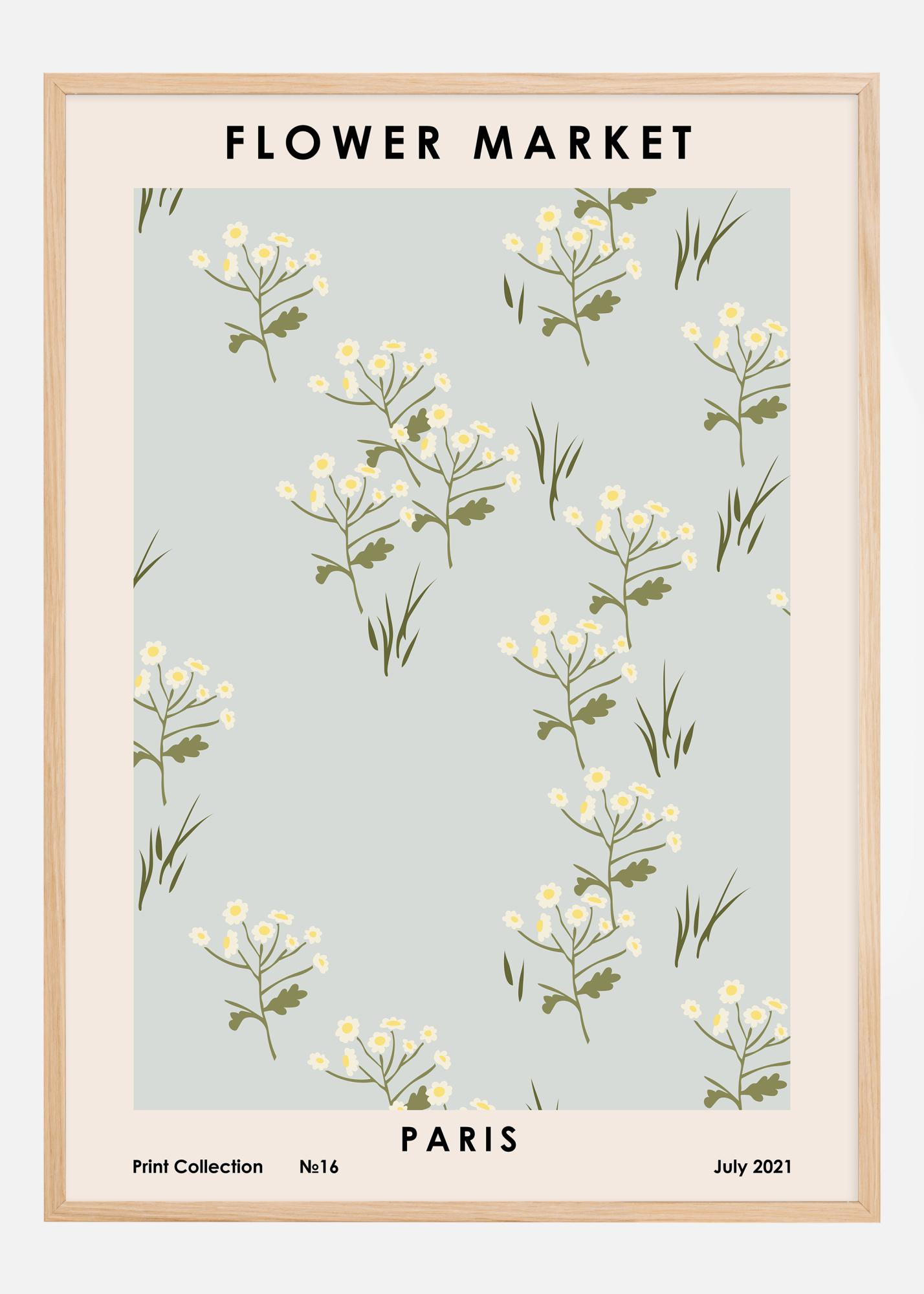 This charming and stylish poster takes you straight to the heart of Paris with its image of a flower market. It features a pattern of delicate white flowers against a calming gray-blue background, providing a sense of freshness and simple elegance. At the top, the text "FLOWER MARKET" appears in a classic typography, while the bottom contains the text "Print Collection '16 PARIS July 2021", adding a sense of authenticity and cultural context.
