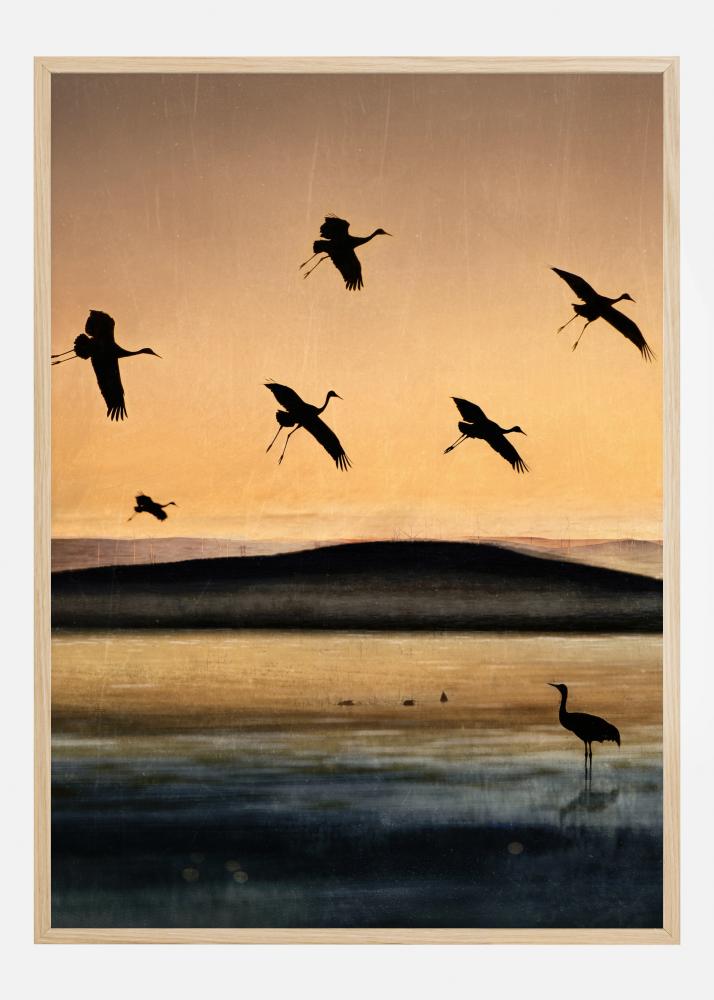 An ambient poster of birds flying at sunset. Six storks take flight, their silhouettes bold against the orange sky and setting sun. A solitary bird stands in the blue and gold lake looking up at the rest as they fly away. Feel the peace of flight in this warm poster.
