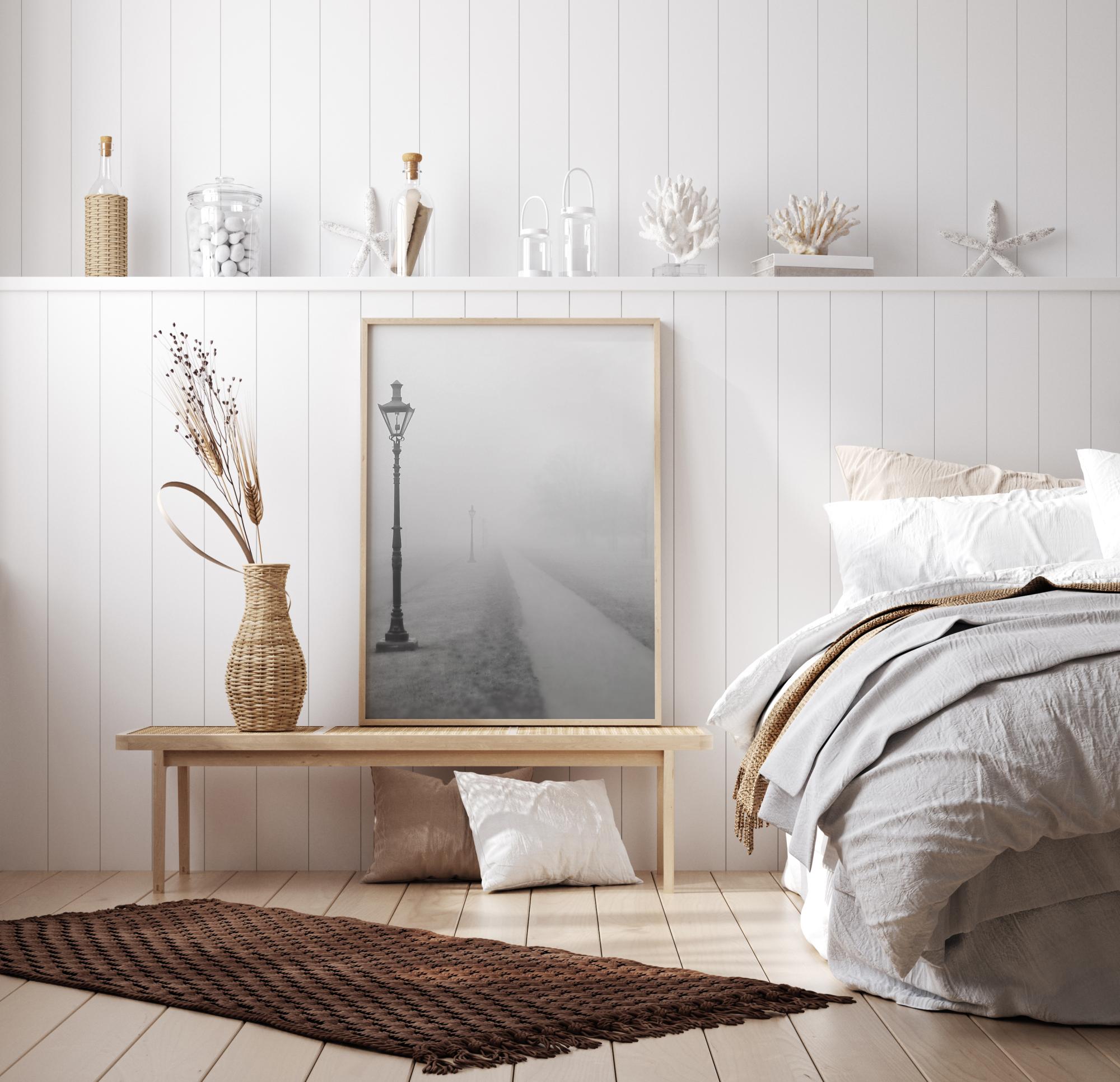 An urban poster of a foggy street. Old-style lamps line a single path that disappears into the fog in the distance. An eerie calm hangs about this subtle photo bringing in that element of winter chill as well. Keep the vibe of this photo by hanging on a white wall.