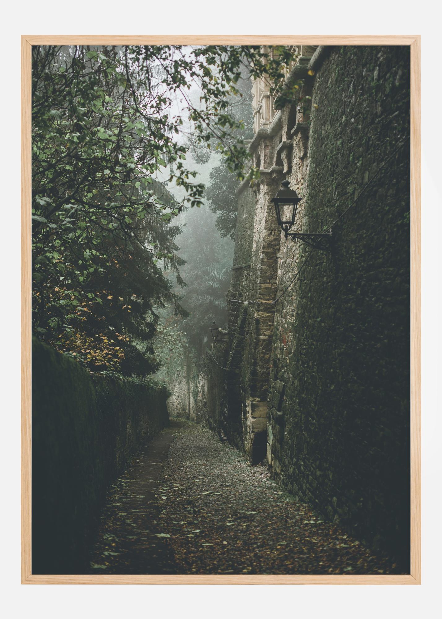 This enchanting poster captures a mysterious and enchanted alley, wrapped in mist and surrounded by the walls of history. The alley, flanked by a moss-covered wall and foliage that quietly hangs down, gives a feeling of having stepped right into another world. An old lantern attached to the building's stonework enhances the historical and romantic feeling that this image conveys.