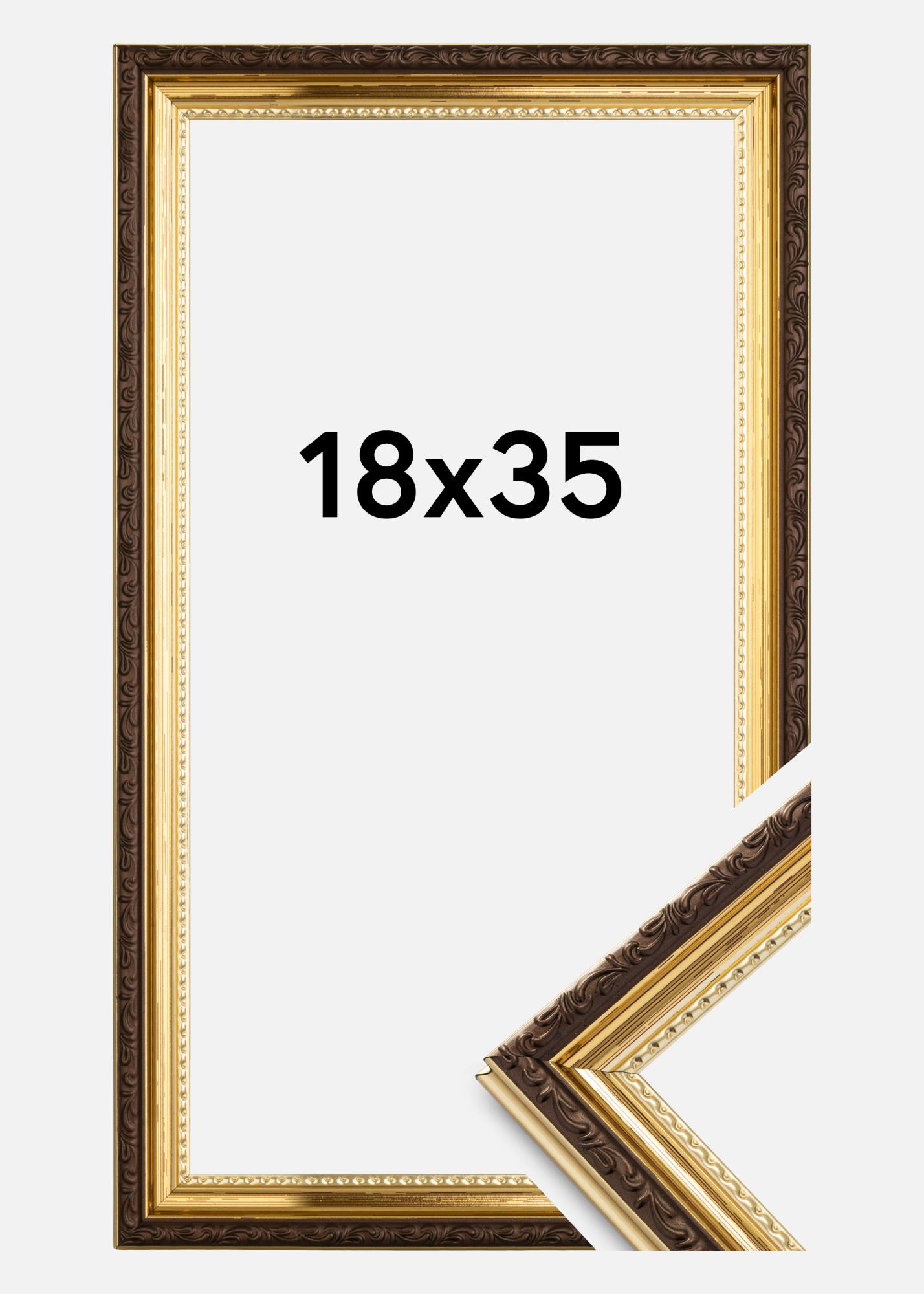 Looking for a beautifully decorated frame in a vintage style? Abisko Acrylic Glass Gold is a sturdy gold frame with unbelievably elegant detailing. The frame is 25mm wide and has a glossy gold colour with ornate brown edging. The vintage look is accentuated by an elegant wave pattern closest to the glass.