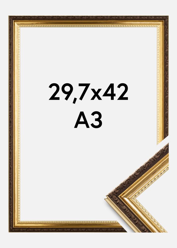 Looking for a beautifully decorated frame in a vintage style? Abisko Acrylic Glass Gold is a sturdy gold frame with unbelievably elegant detailing. The frame is 25mm wide and has a glossy gold colour with ornate brown edging. The vintage look is accentuated by an elegant wave pattern closest to the glass.